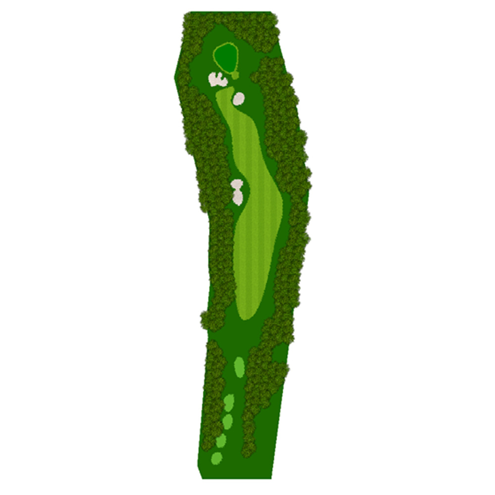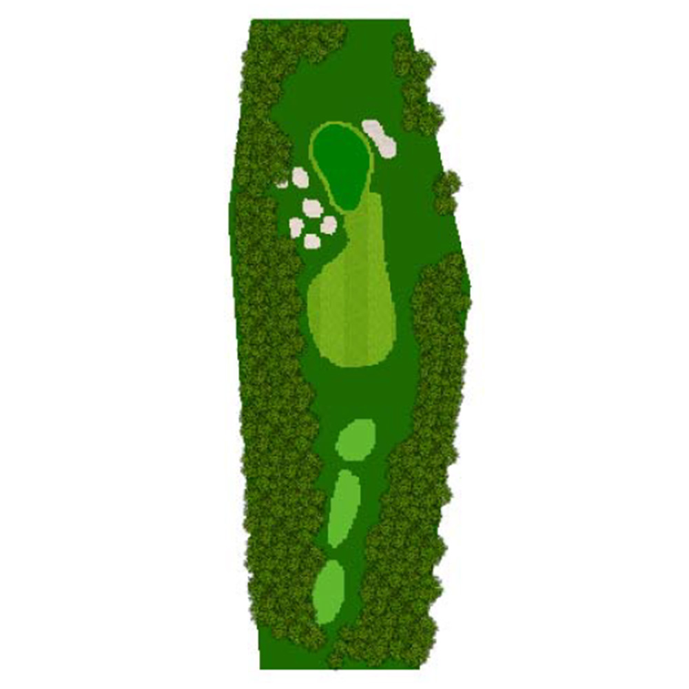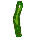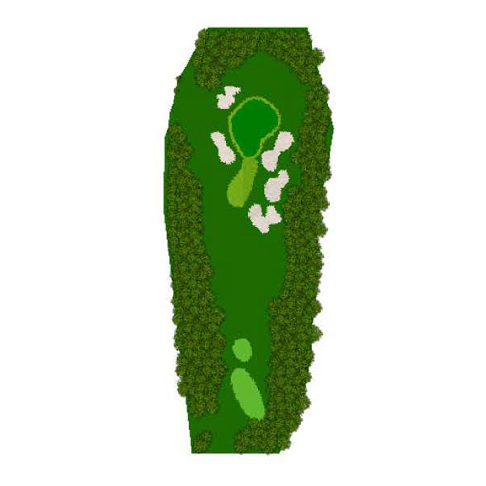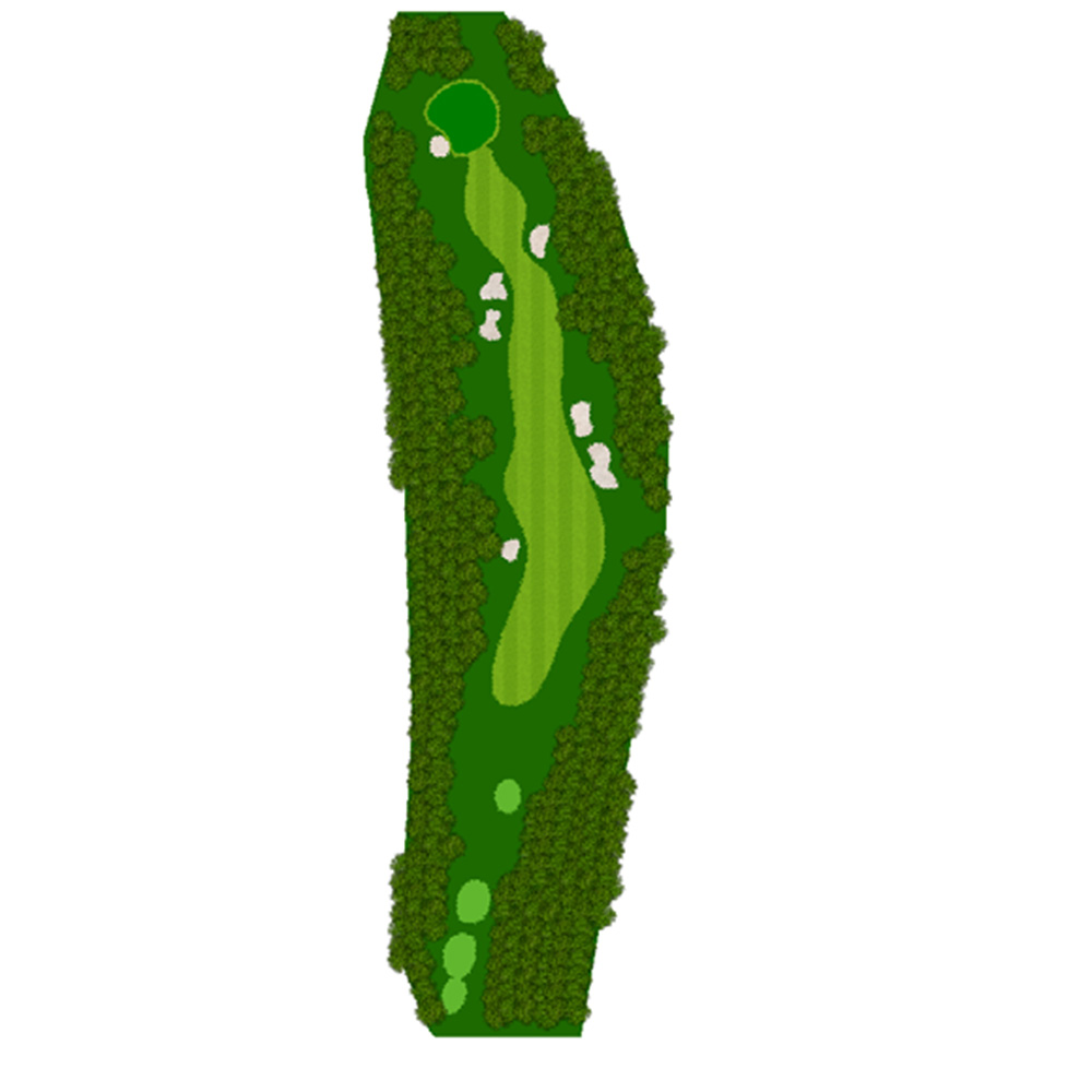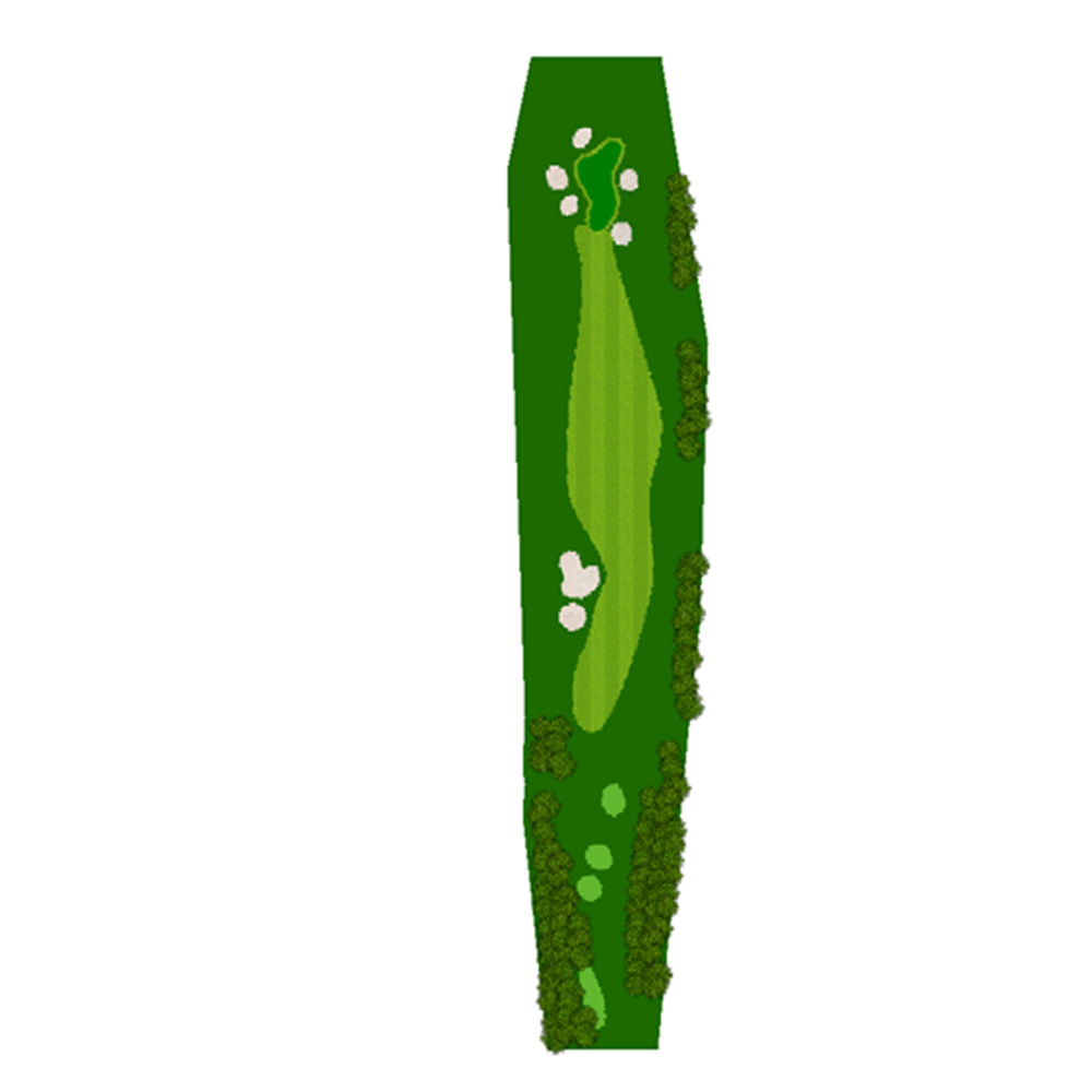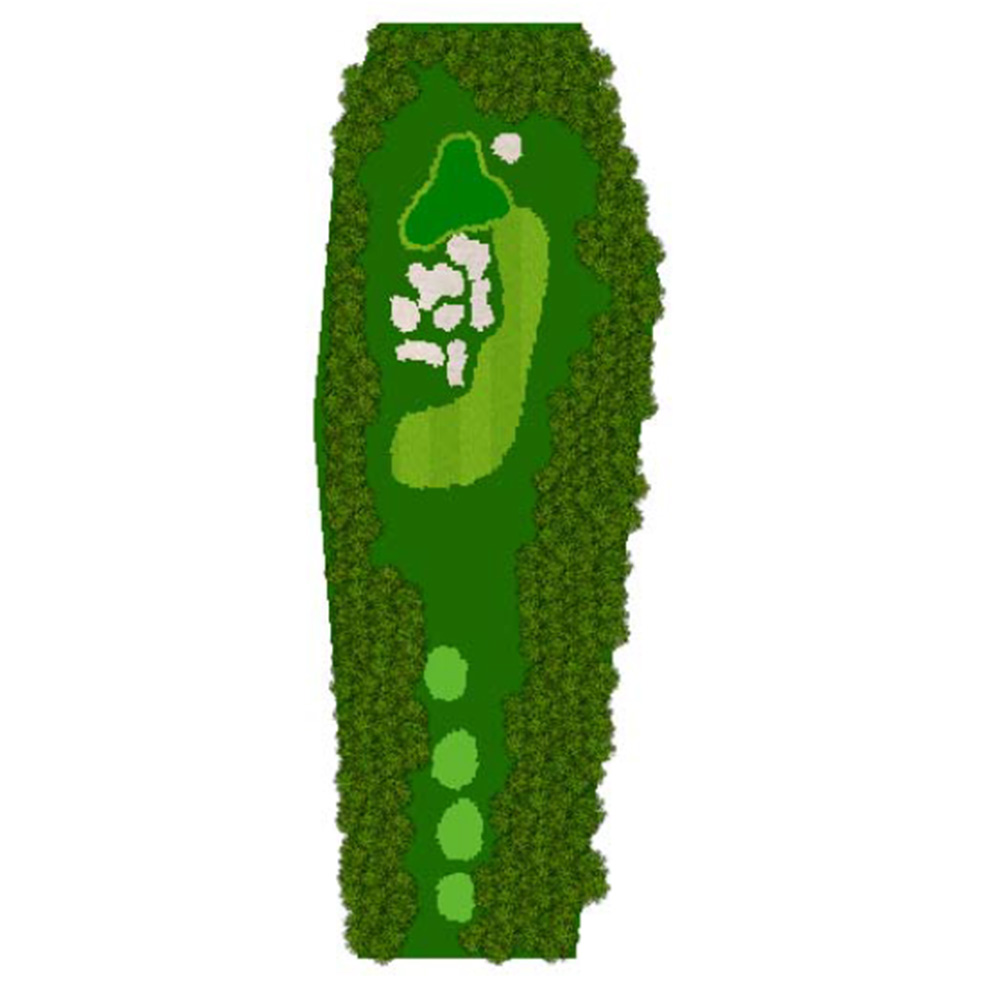 ティーショットはフェアウェーバンカー方向狙い。二打目からはアップヒルとなる。グリーン左右のガードバンカーに注意。