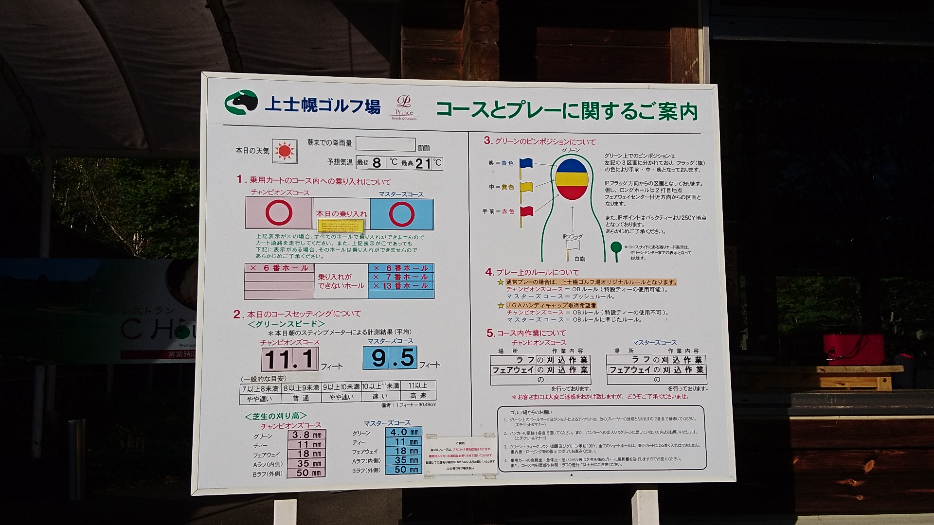 またコースの案内看板にて、その日のグリーンスピードや、芝生の刈高、
