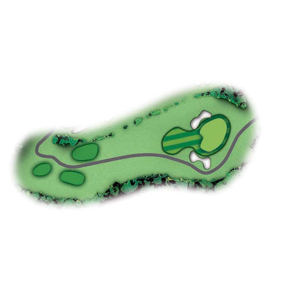 フラットでストレートなミドルホールだがグリーンは大きく、傾斜も複雑、バッティングは慎重に。