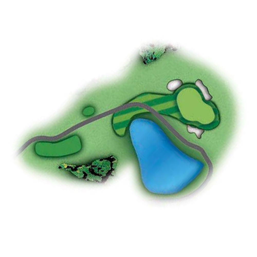 池越えのパー3ホール。目の前に広がりグリーンもガードバンカーに囲やや打ち上げのショートホール。グリーン左手前のバンカーは避け、右から攻める。