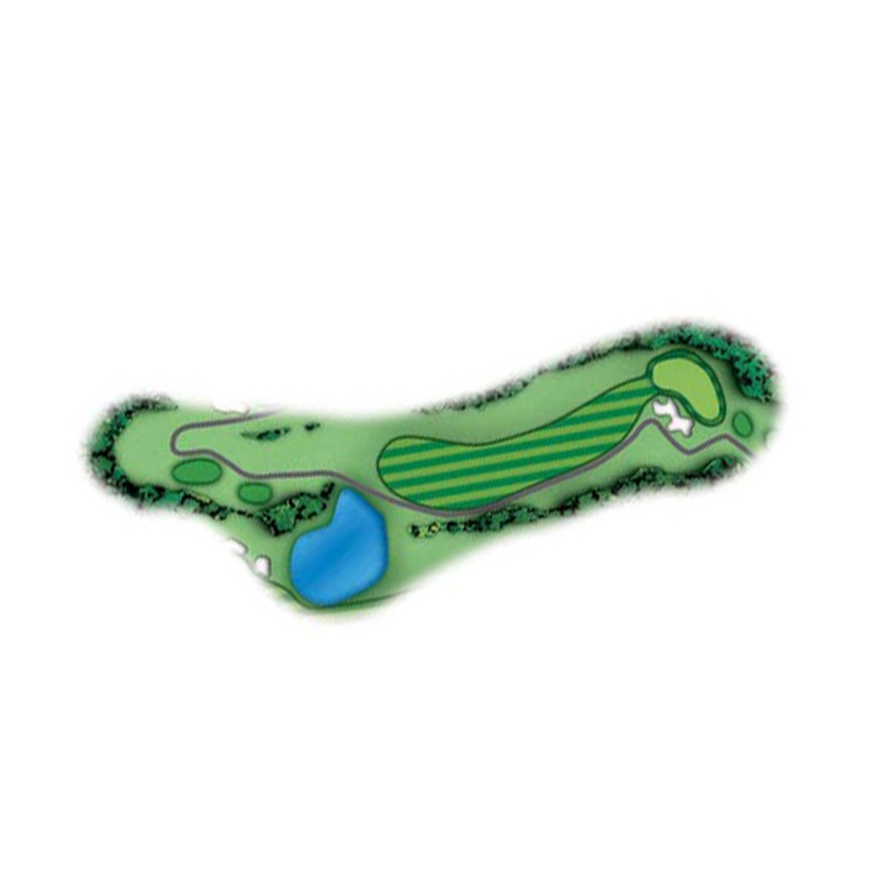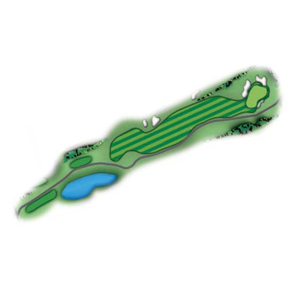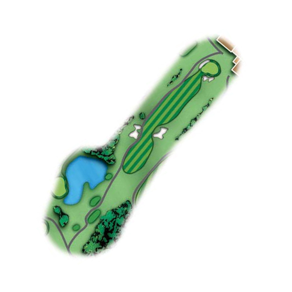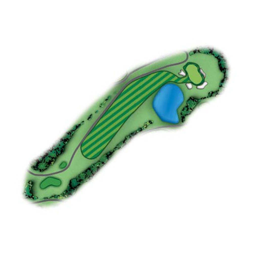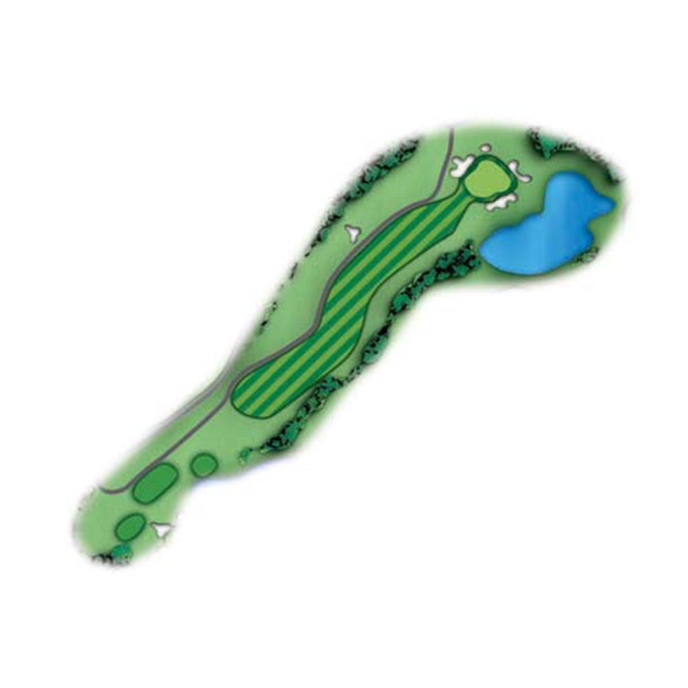 Z型のロングホール。グリーン手前に大きな池があり、アプローチは 打ち上げになる。ロングヒッターには2オンも可能。