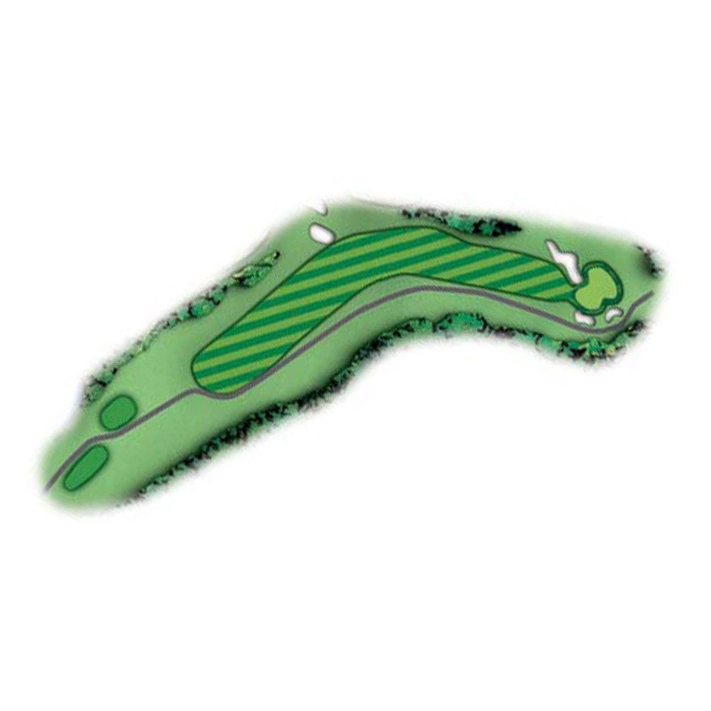 直角に左ドッグレッグしたミドルホール。第1打は左側の林の右を狙う。ロングヒッターは林越えのショートカットも可能。