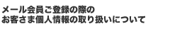メールの配信にあたって、メールアドレスなどの登録をお願いしております。収集したメールアドレスは、本メールの配信に限り使用します。またその他ご登録いただきました情報につきましては、メールの制作や配信、ホームページの制作、お客さまへのサービスの向上のための参考として利用します。他の目的で使用することはありません。ご登録いただきました個人情報は細心の注意をもって取り扱い、厳重に保管いたします。