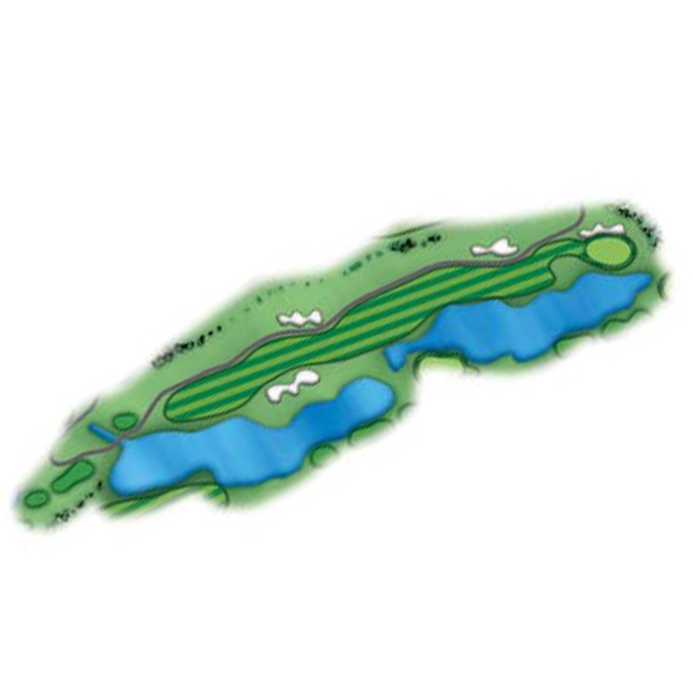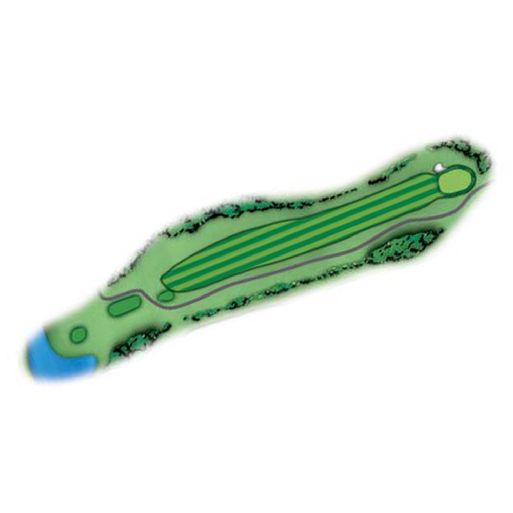 やや打ち下ろしのストレートなロングホール。グリーン右手前の池に注意し、左サイドから慎重に攻めたい。