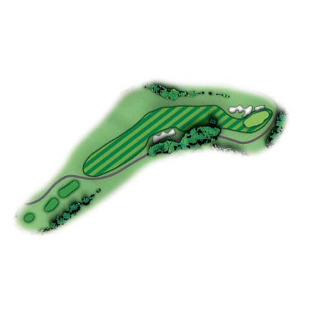 左ドッグレッグのロングホール。第1打はフェアウェー右側クロスバン力ーの左側へ。グリーン周りは左右・奥ともアプローチは難しく、手前から攻めたい。