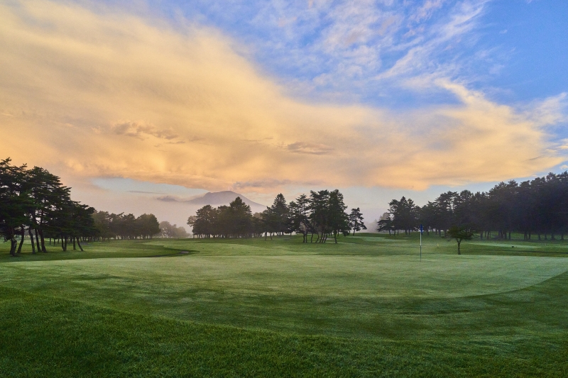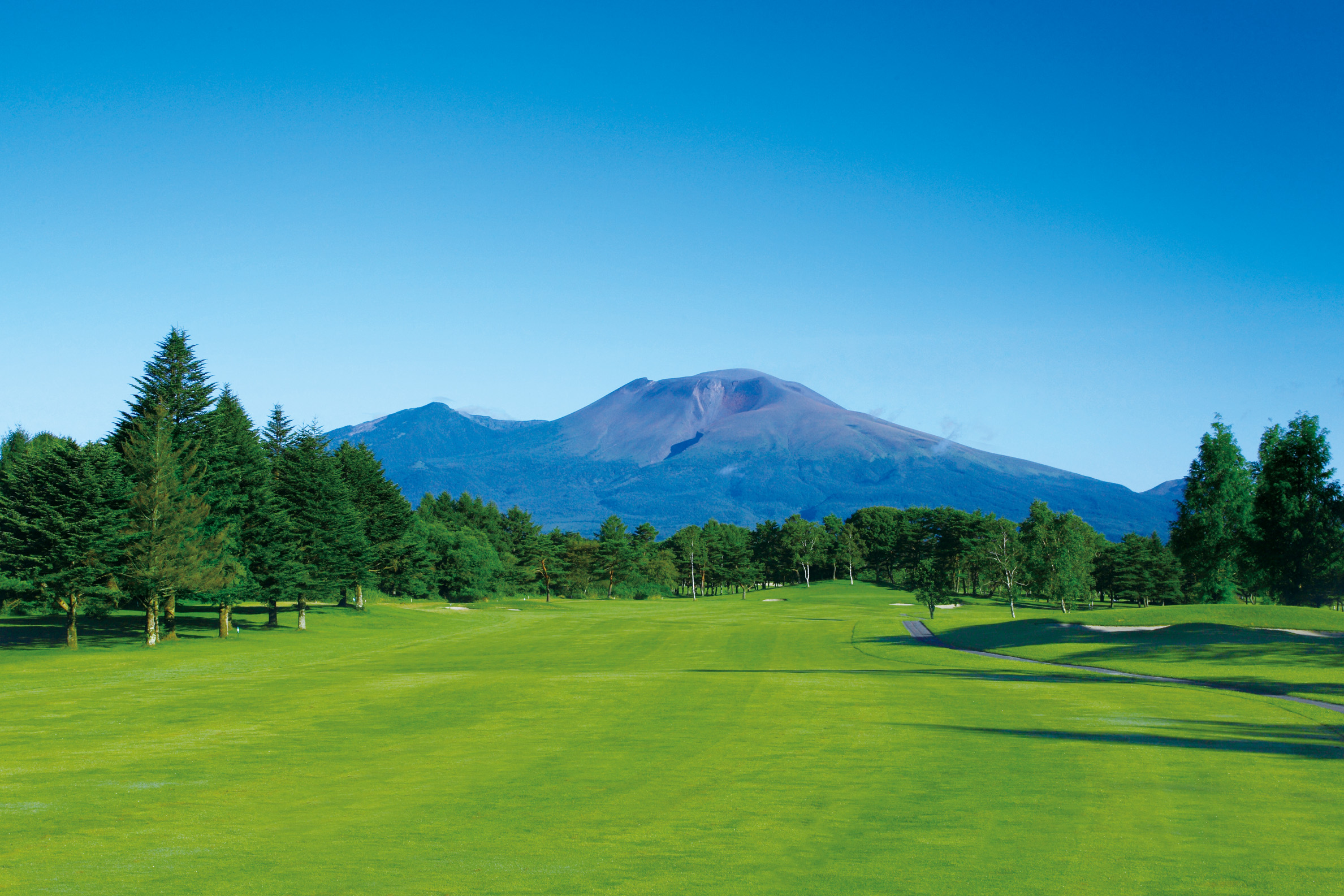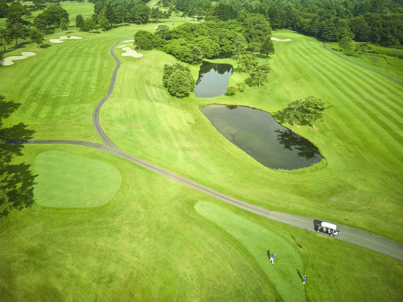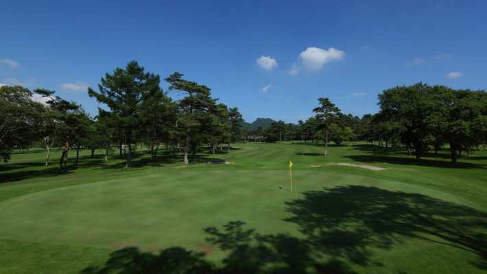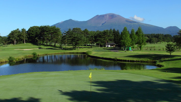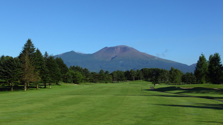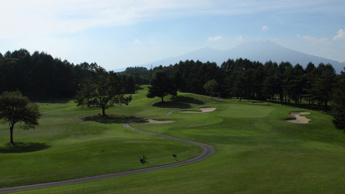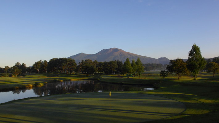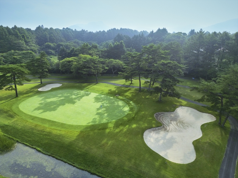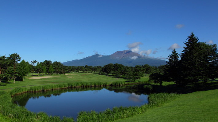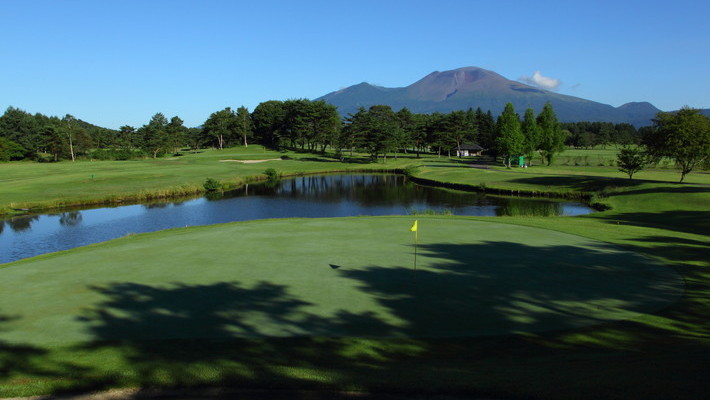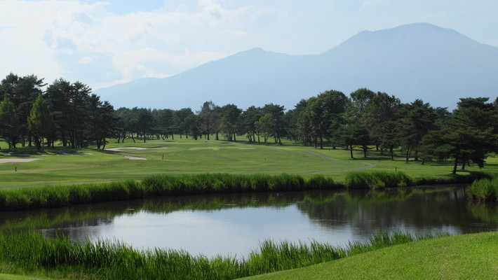 池越えのストレートなミドルホール。池は気にせず浅間山に向かって豪快にショットをしたい。