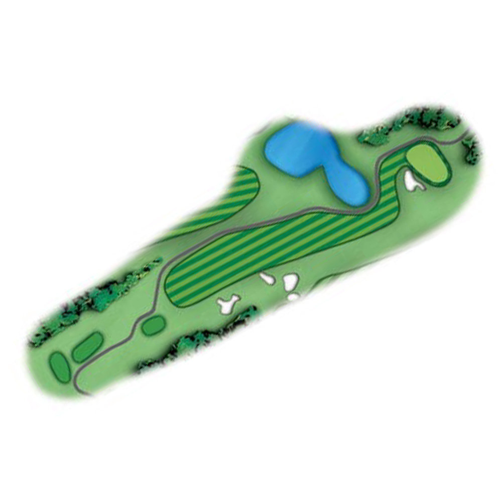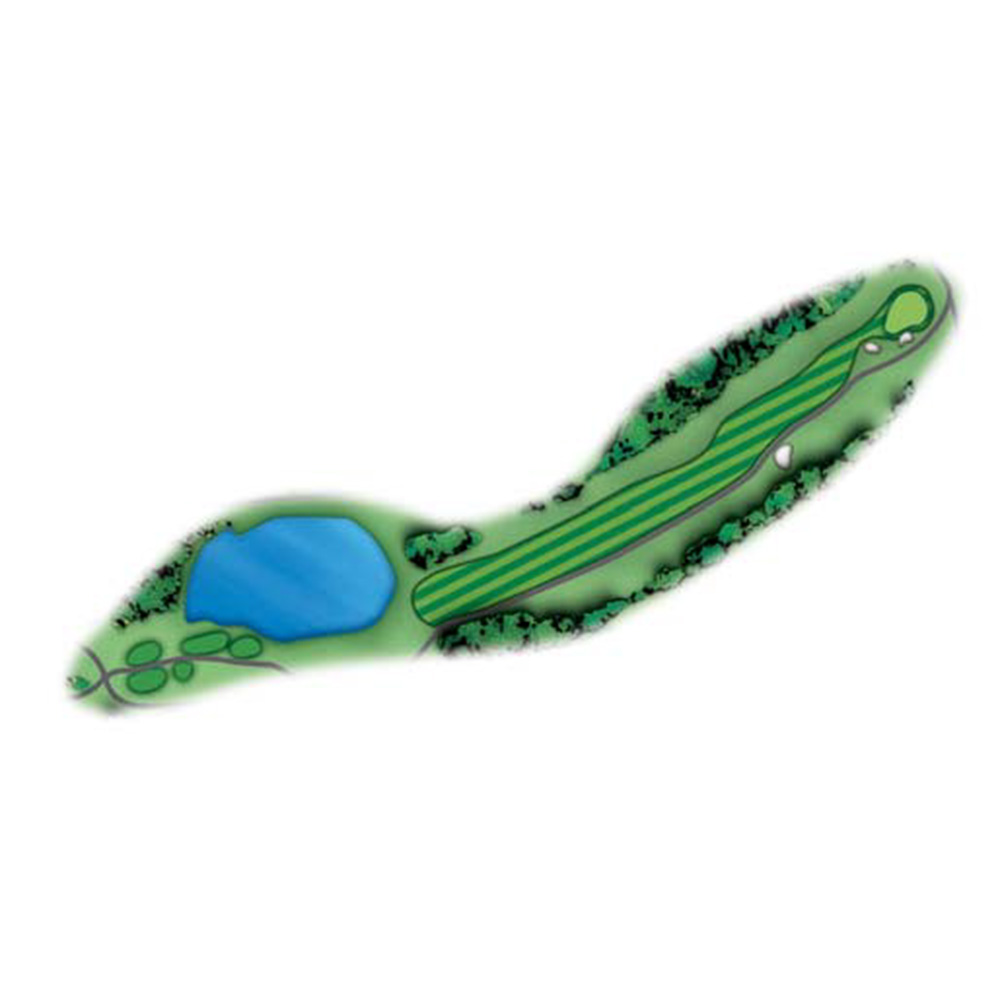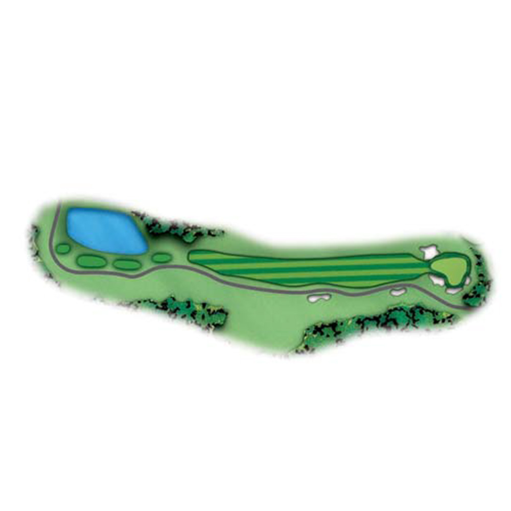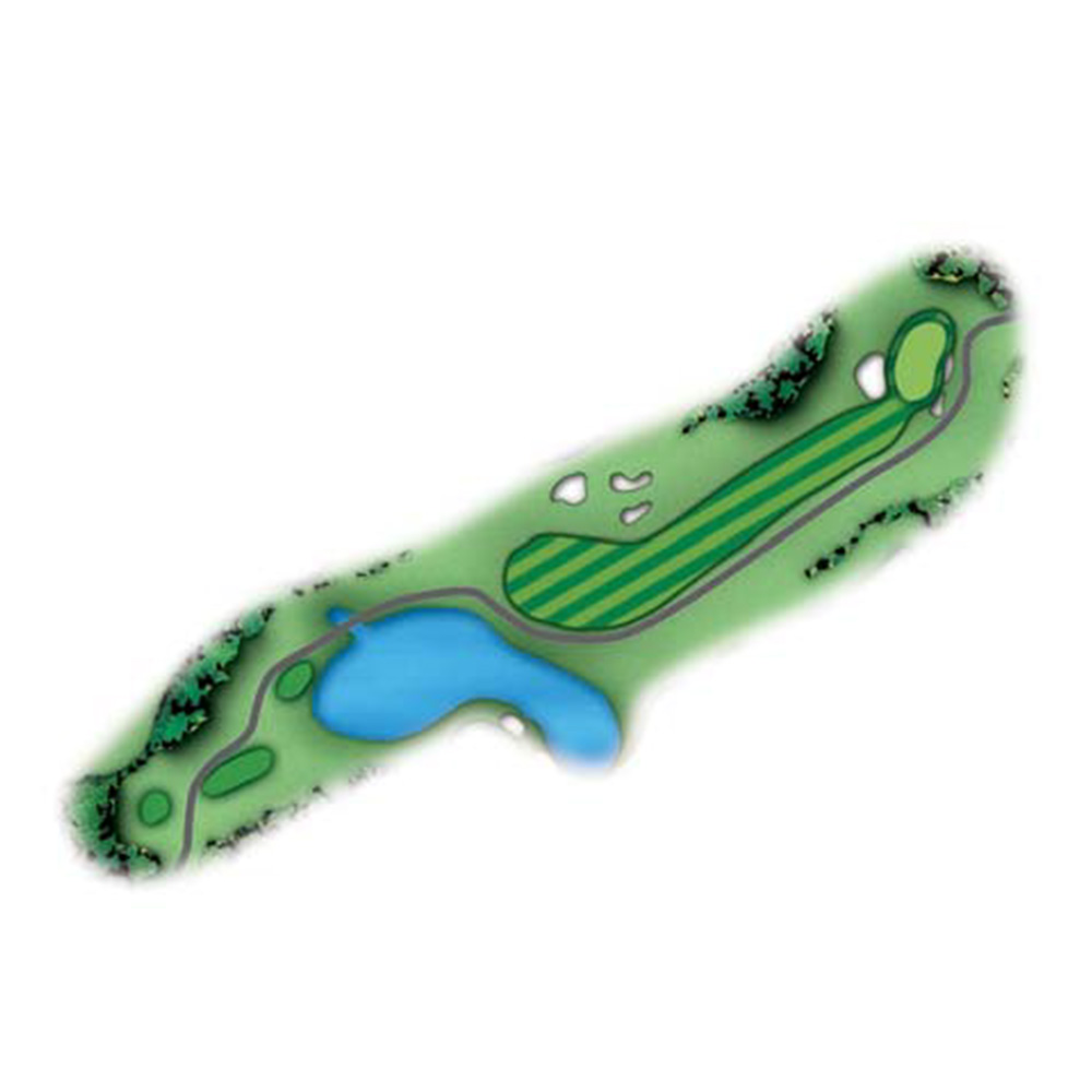 左にゆるく曲がった口ングホール。第1打は目の前の池がプレッシャーとなるが、 クリアすれば残りは思い切り攻めたい。