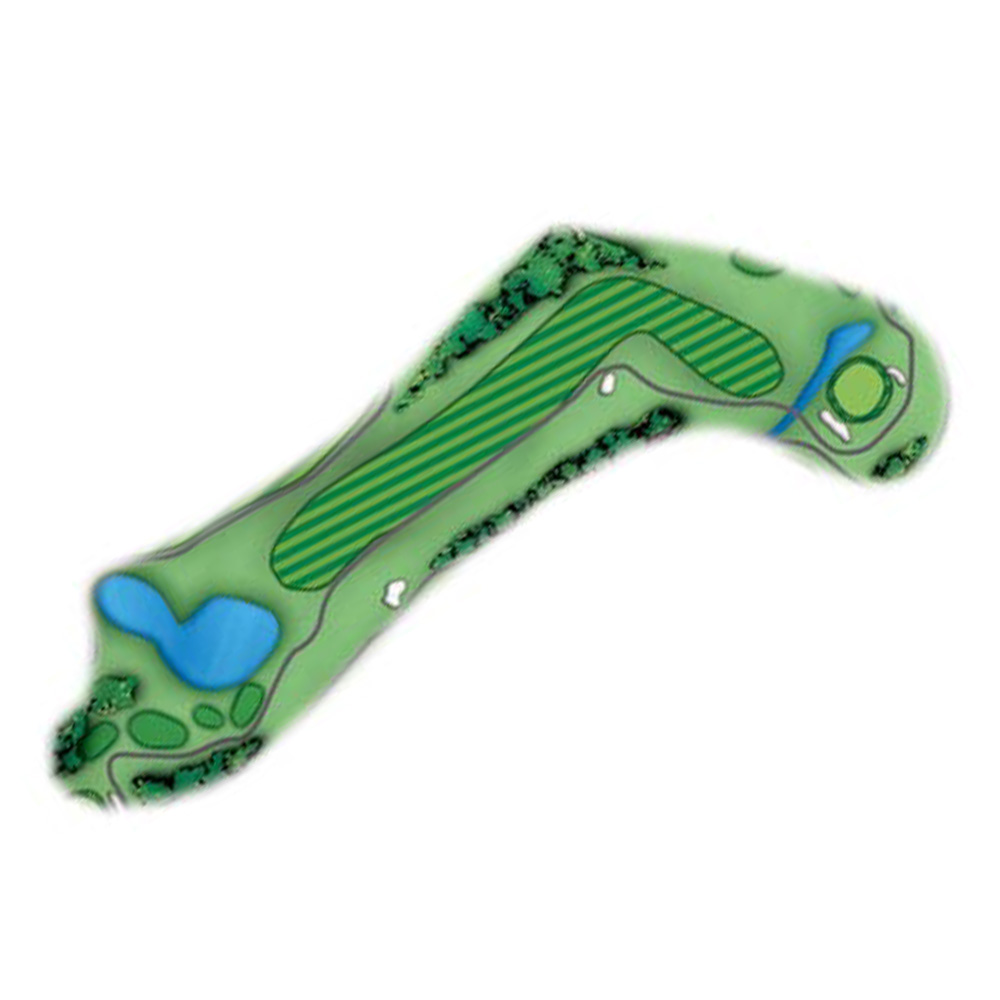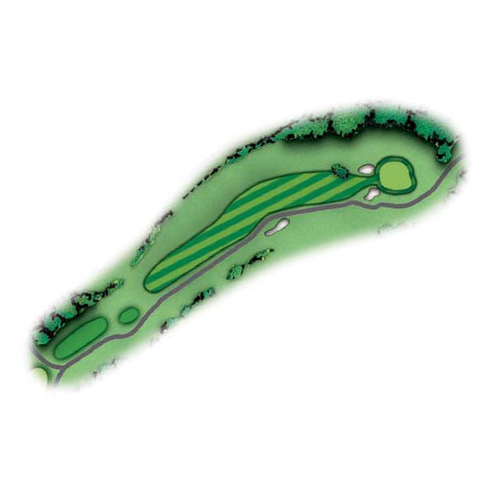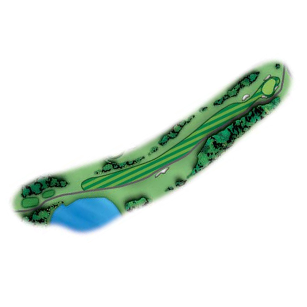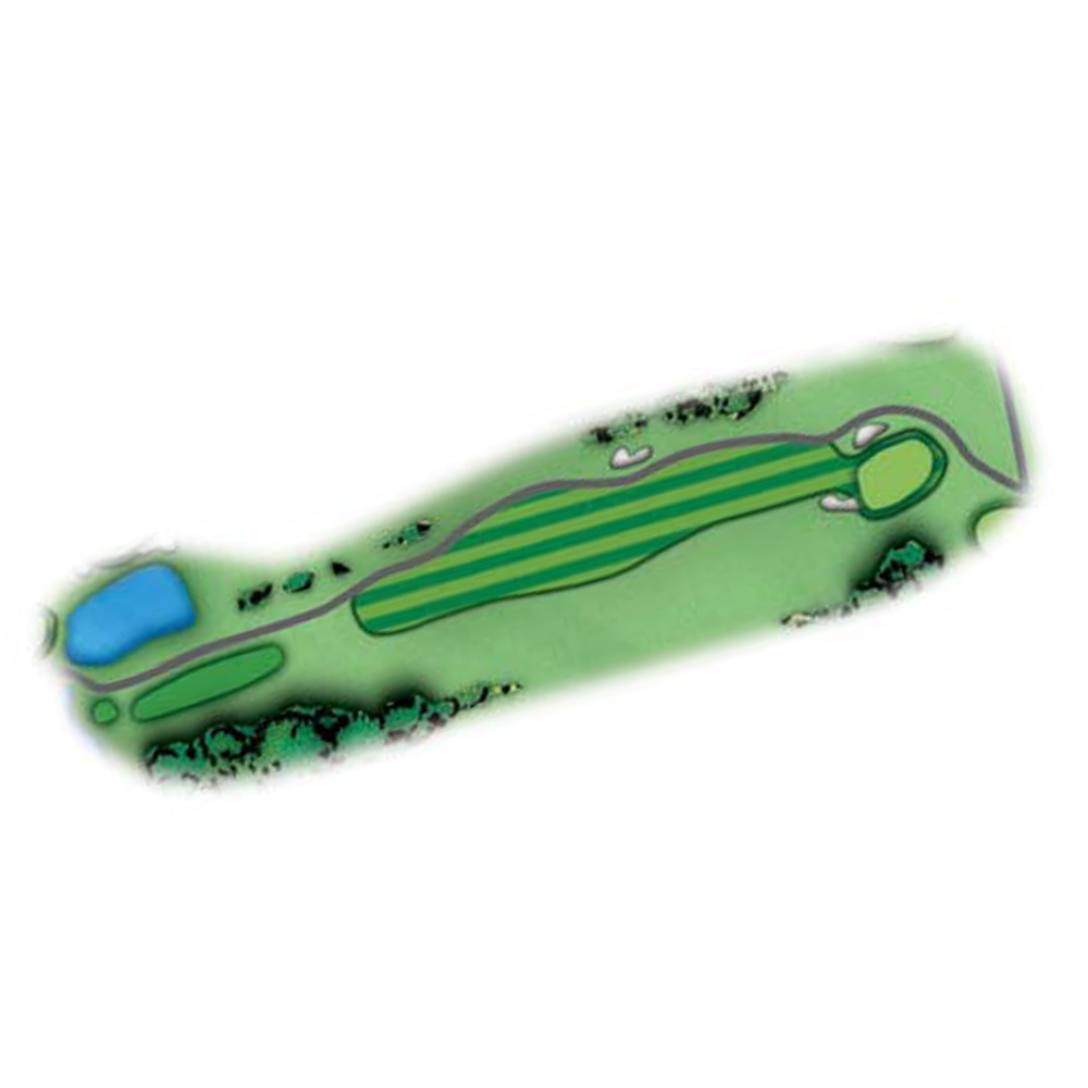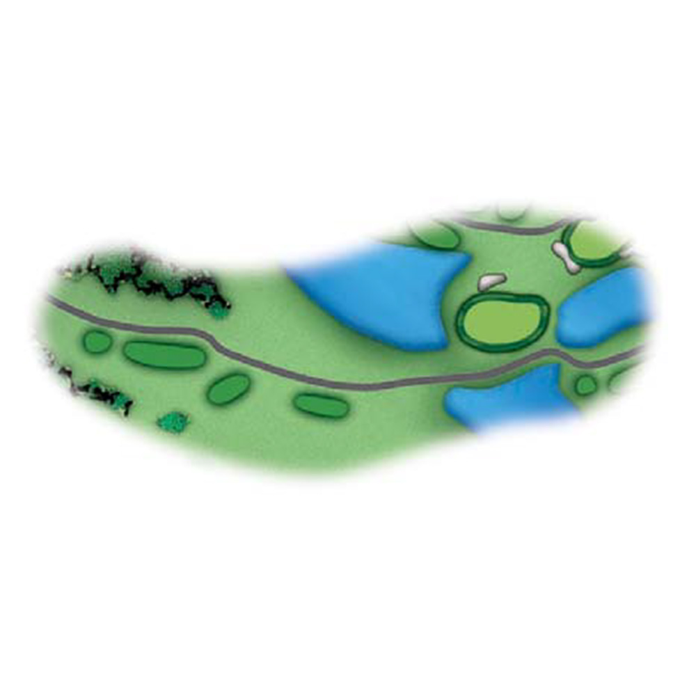 左にゆるく曲がった口ングホール。第1打は目の前の池がプレッシャーとなるが、 クリアすれば残りは思い切り攻めたい。