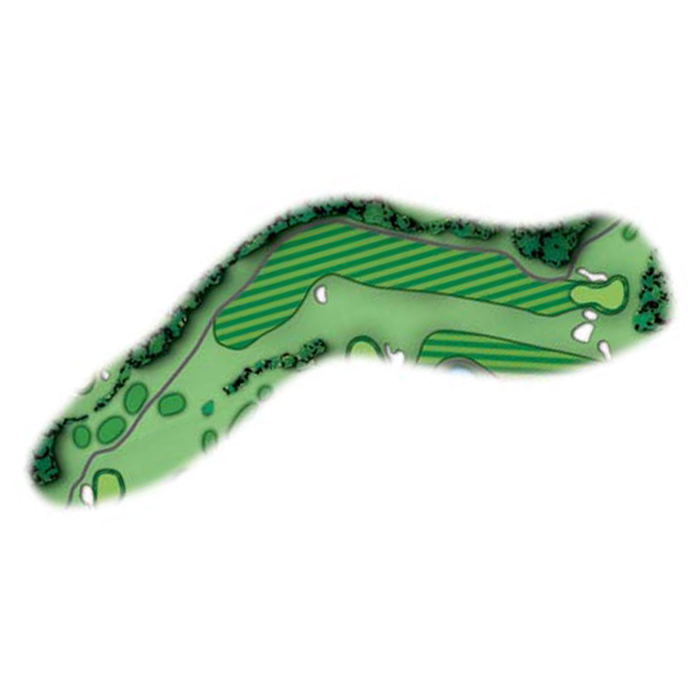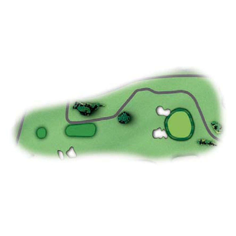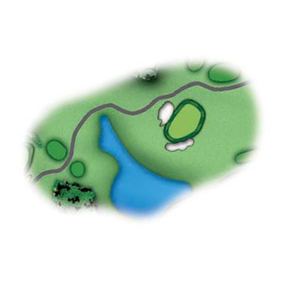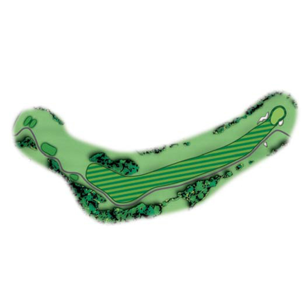 左にゆるく曲がった口ングホール。第1打は目の前の池がプレッシャーとなるが、 クリアすれば残りは思い切り攻めたい。