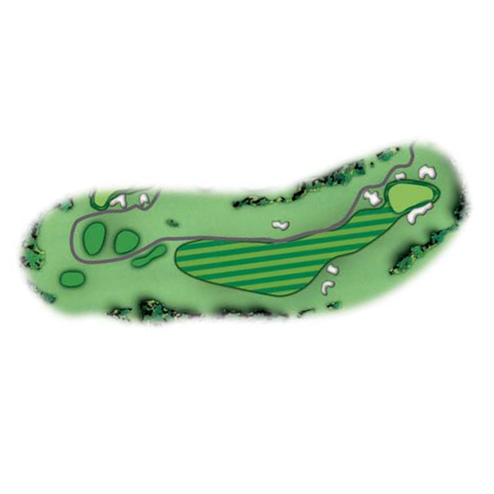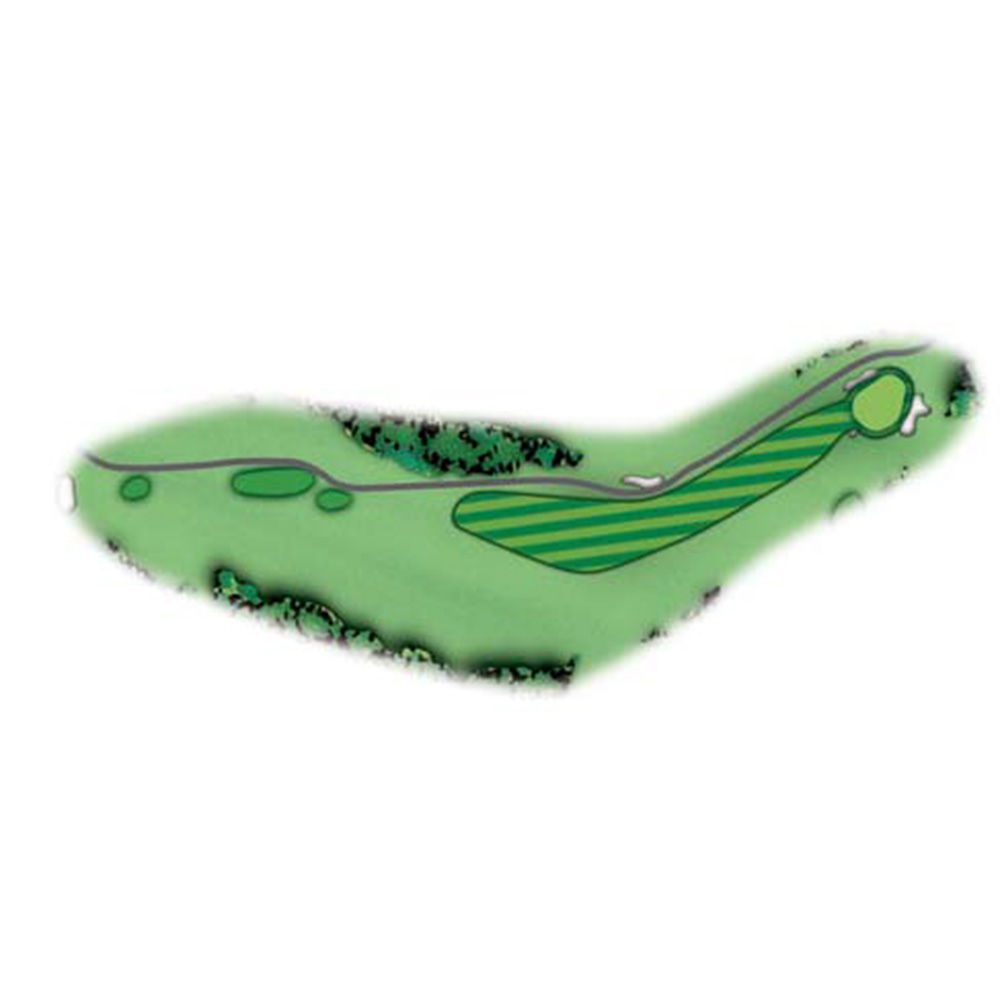 右ドッグレッグの口ングホール。残り100ヤードから打ち上げになる。奥行き49ヤードのグリーンも要注意。