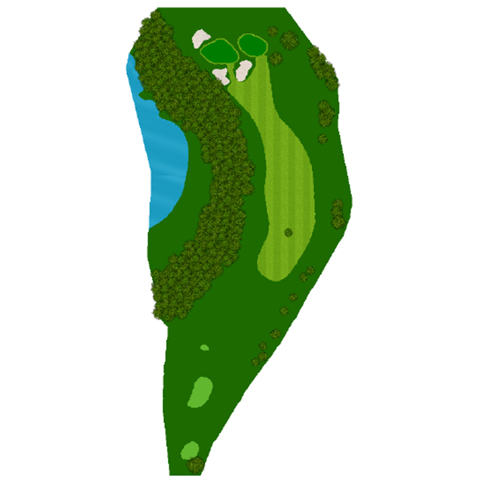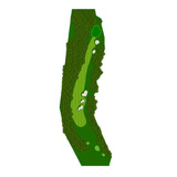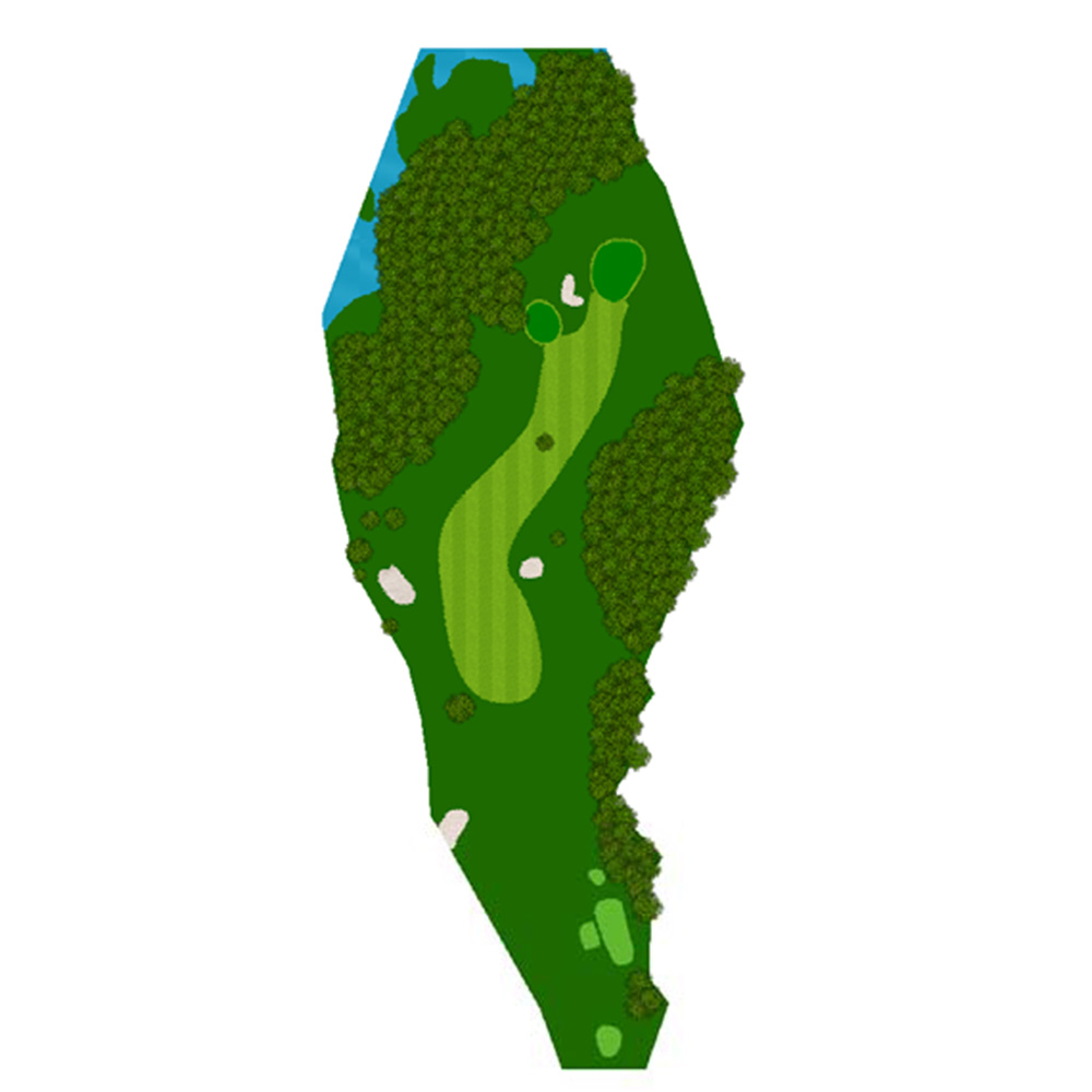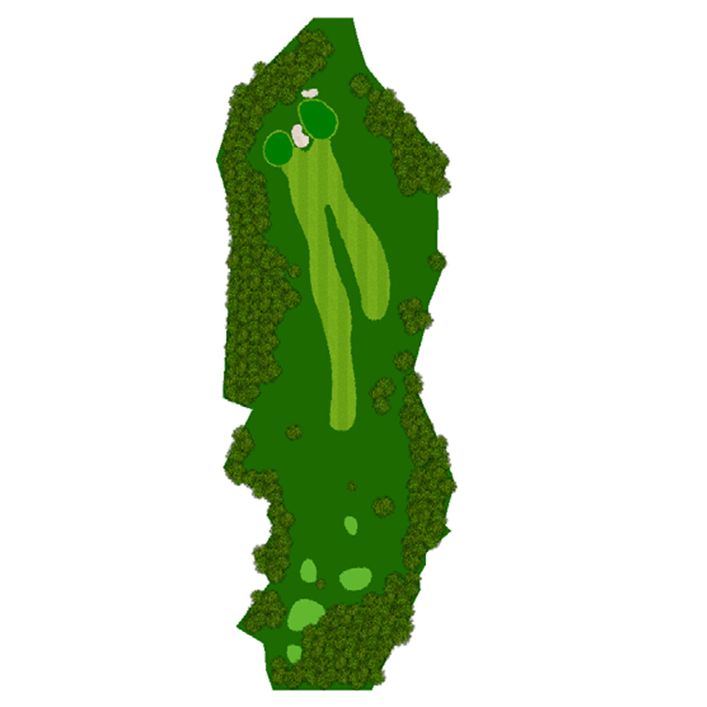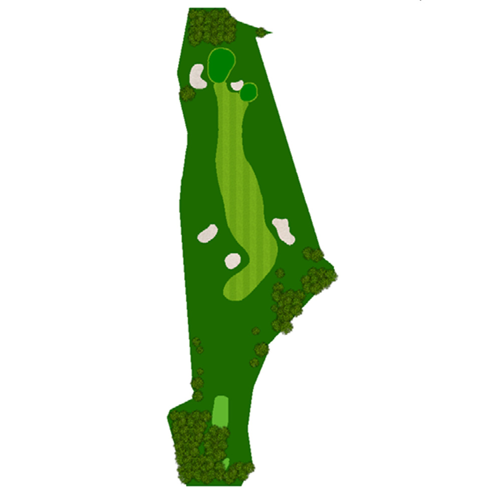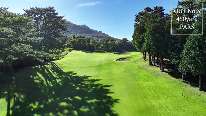 正面の3段バンカーが特徴的な右ドレッグのパー5.セカンドはきつい打ち上げになるがティーショット次第で2オン可能。