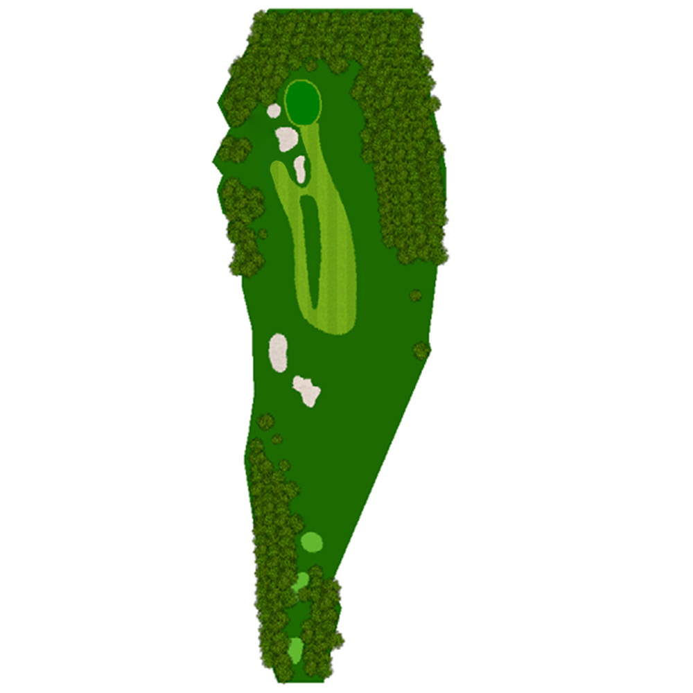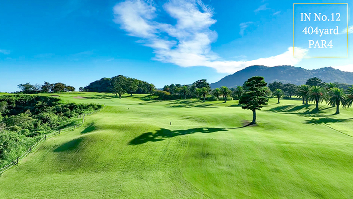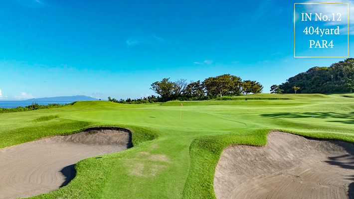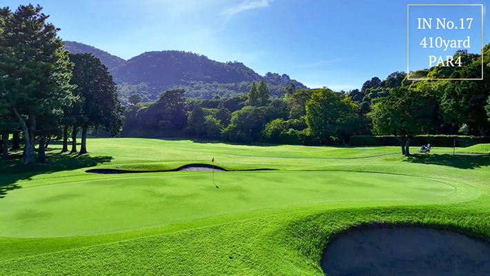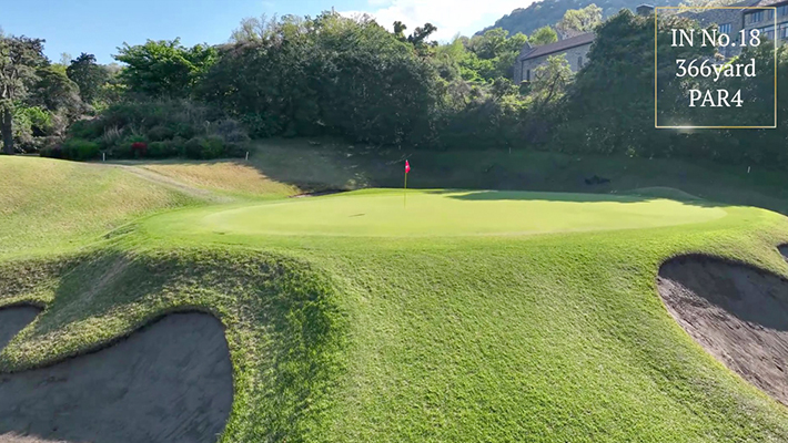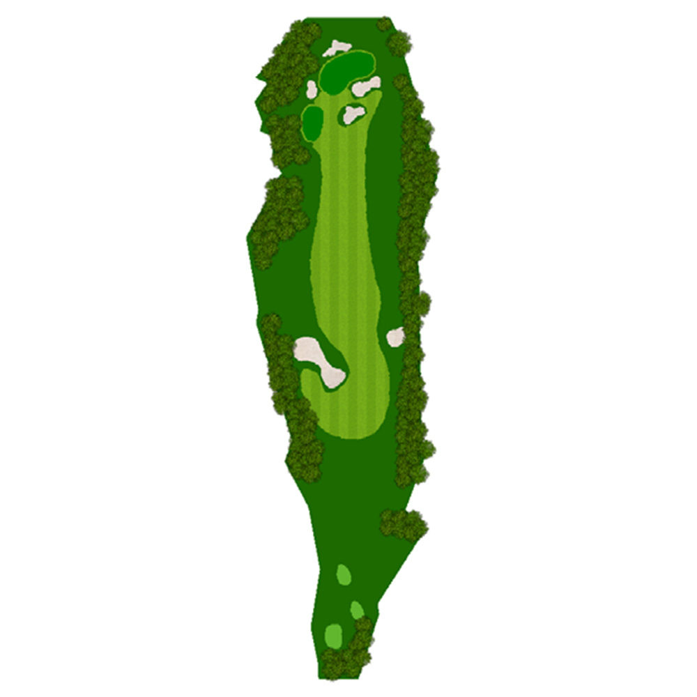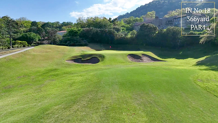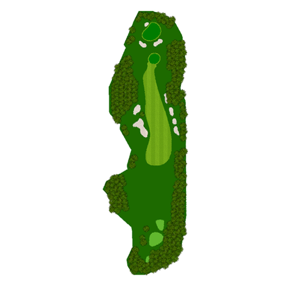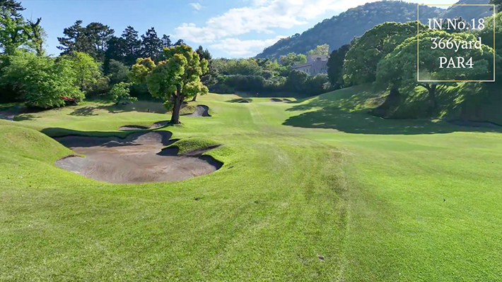 距離はないが左右にバンカー群があり飛距離よりフェアウェーキープを優先に考えたい。グリーンは右奥から順目、傾斜に注意。左奥に隠しバンカーあり。