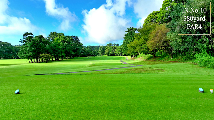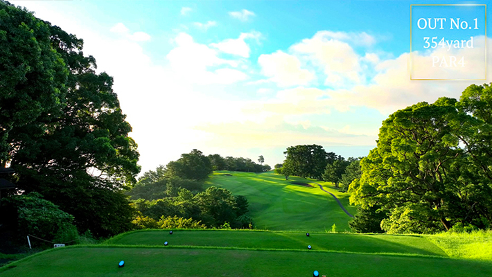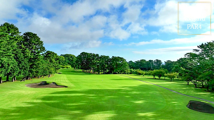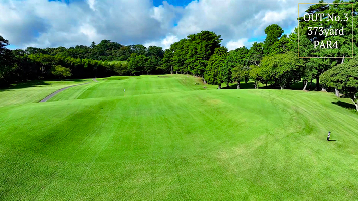 広々とした、平和に見えるやや左ドッグレッグ。ティーショットはセンター狙いで豪快に。