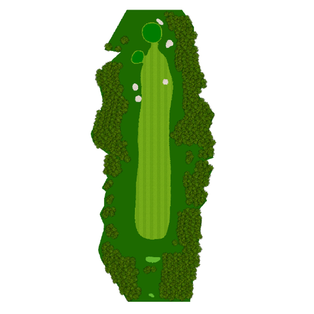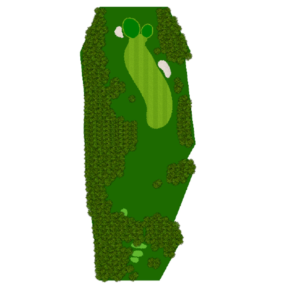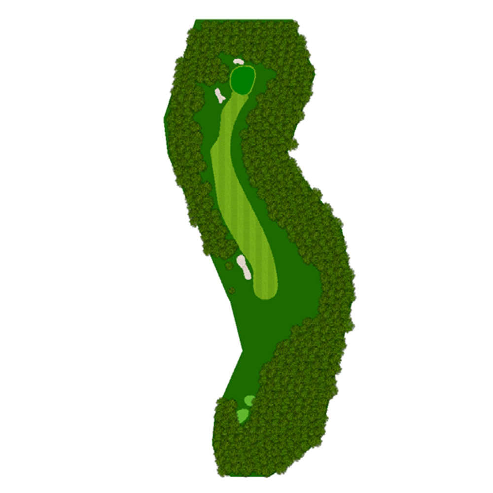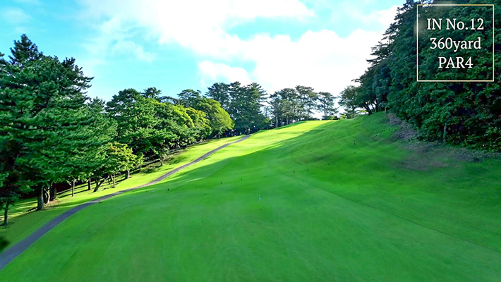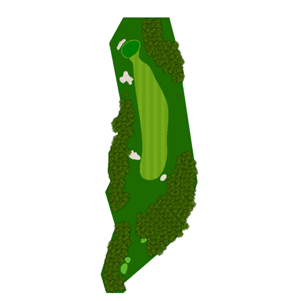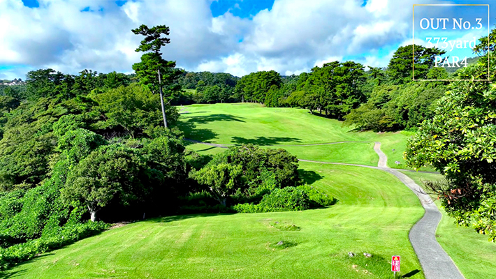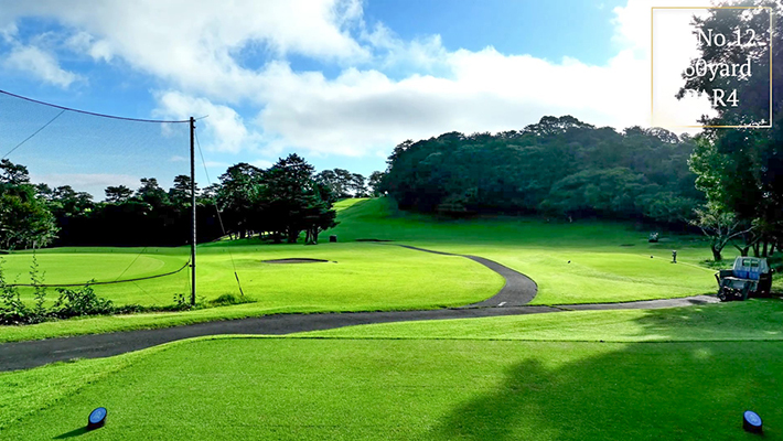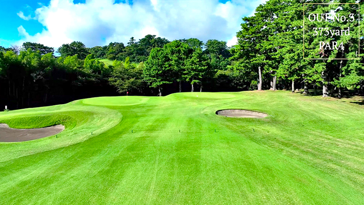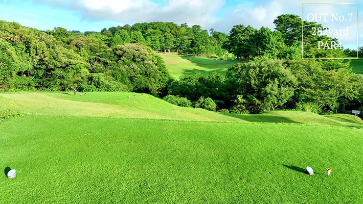谷越えの左ドッグレッグ。狙い目はバンカー右サイド。距離の出る人はバンカー真上から。ただし左の林に注意。