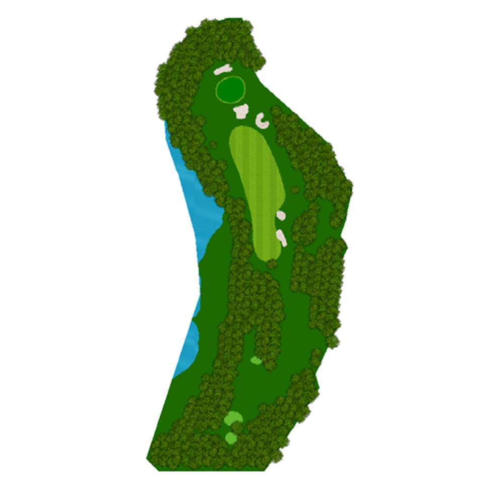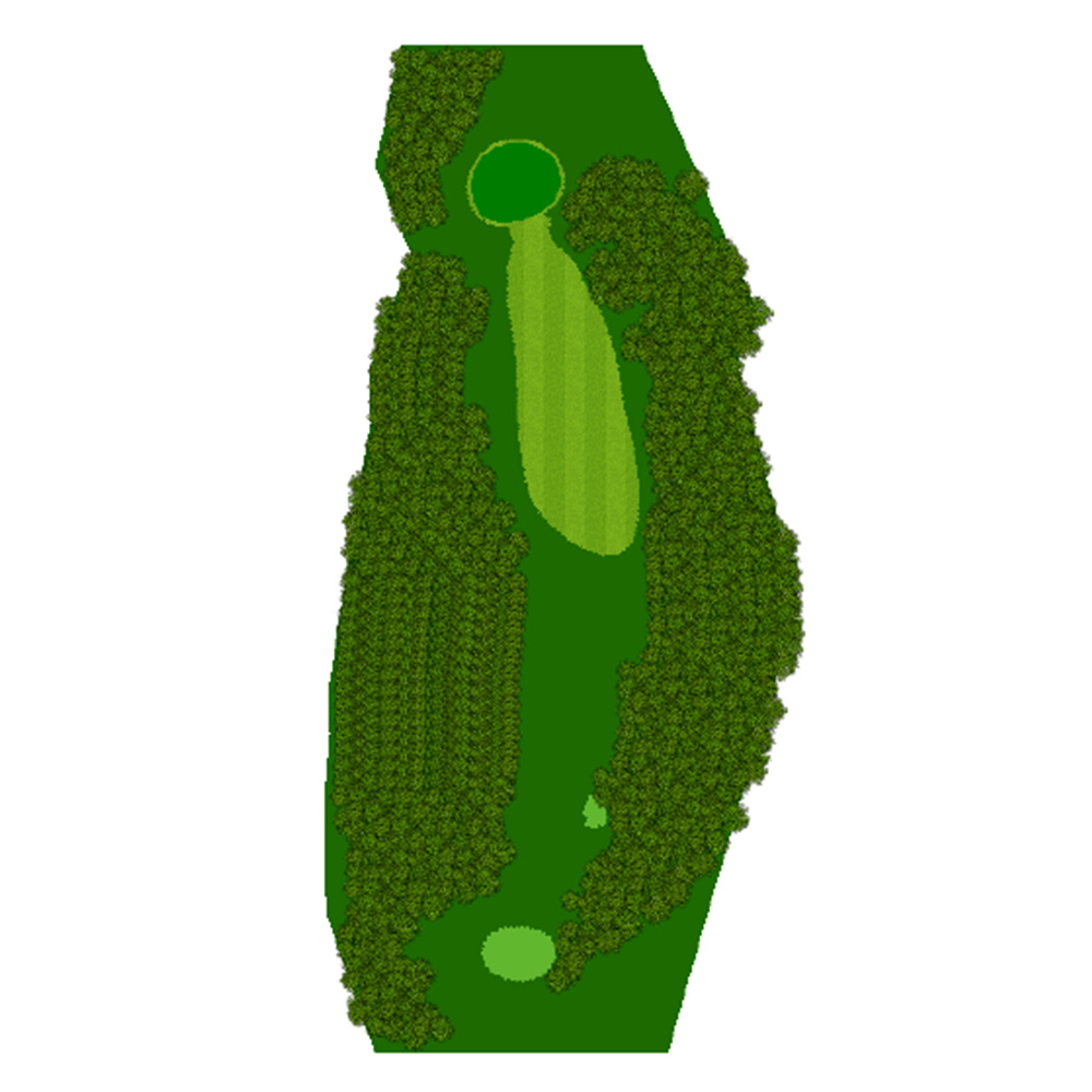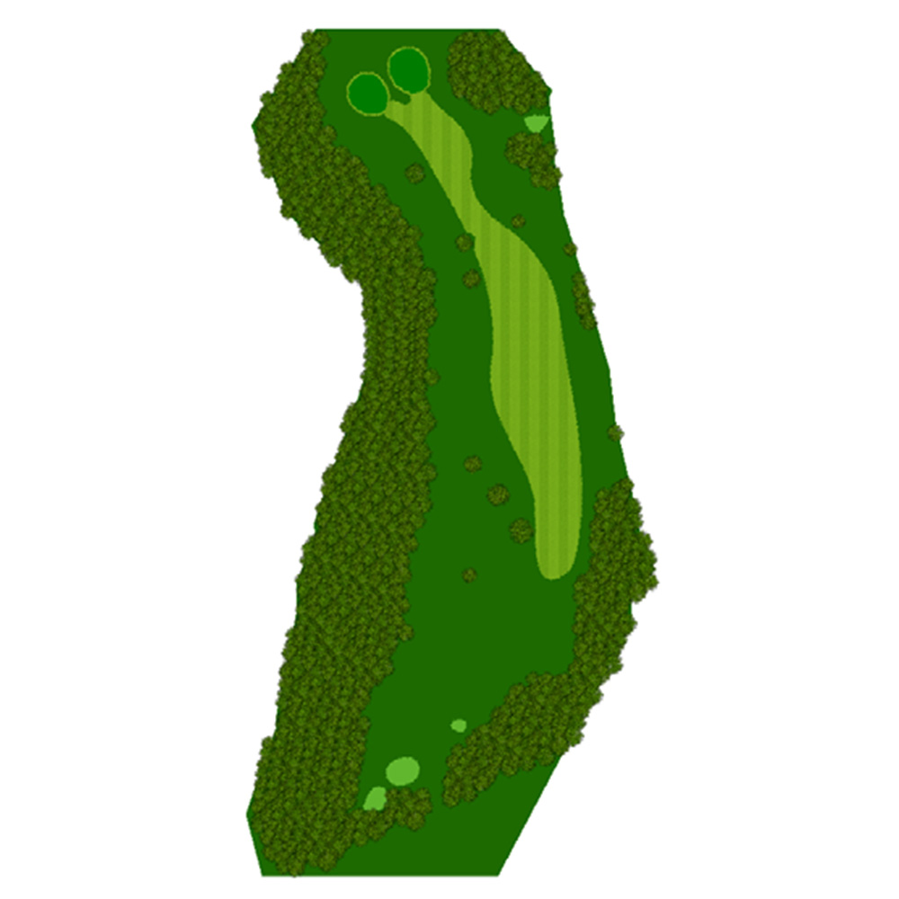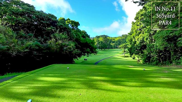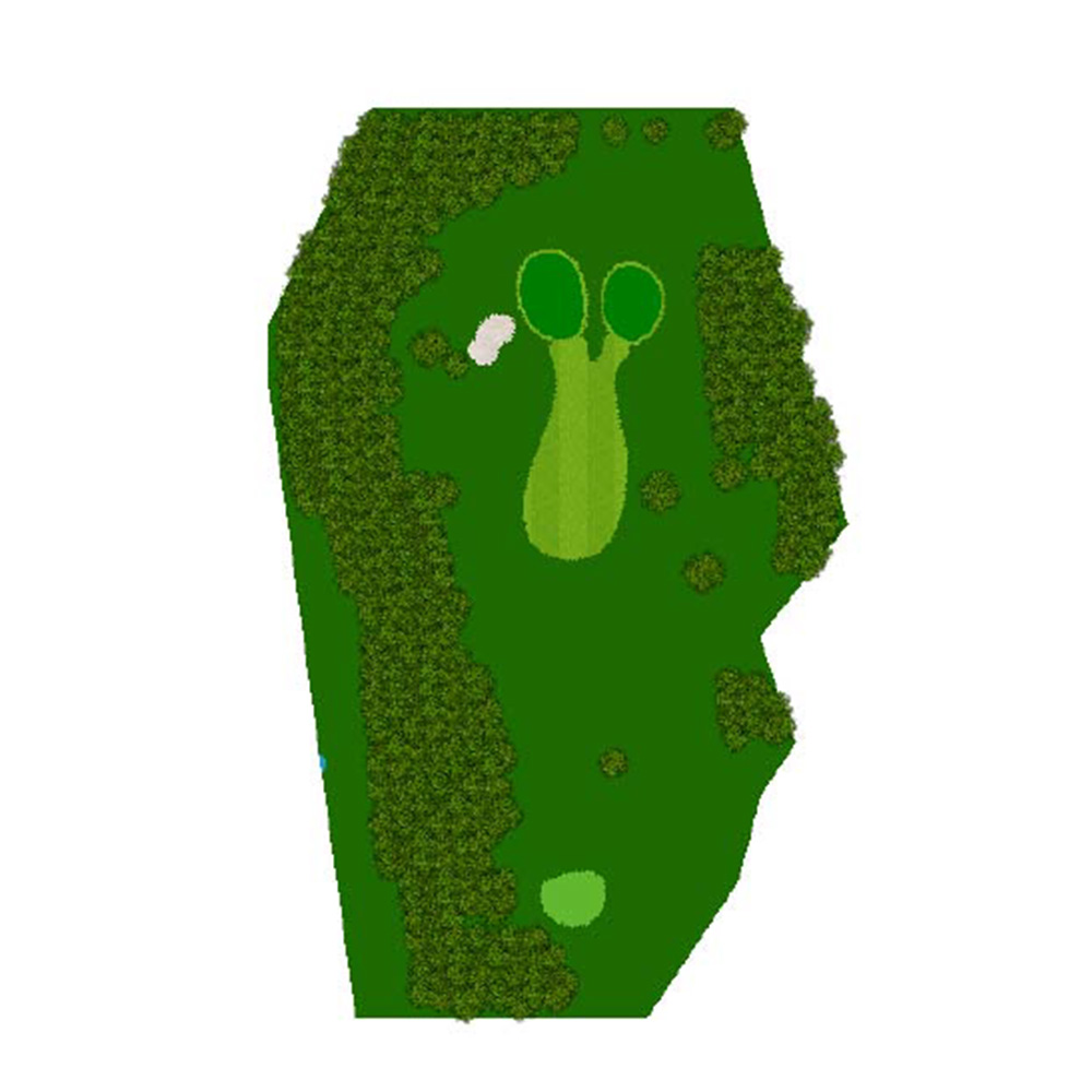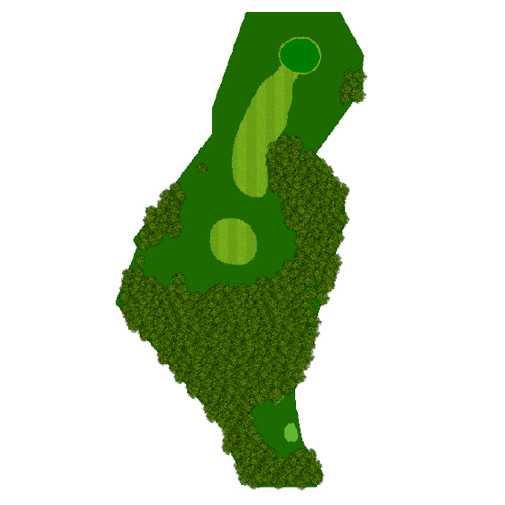 谷越えの左ドッグレッグ。狙い目はバンカー右サイド。距離の出る人はバンカー真上から。ただし左の林に注意。
