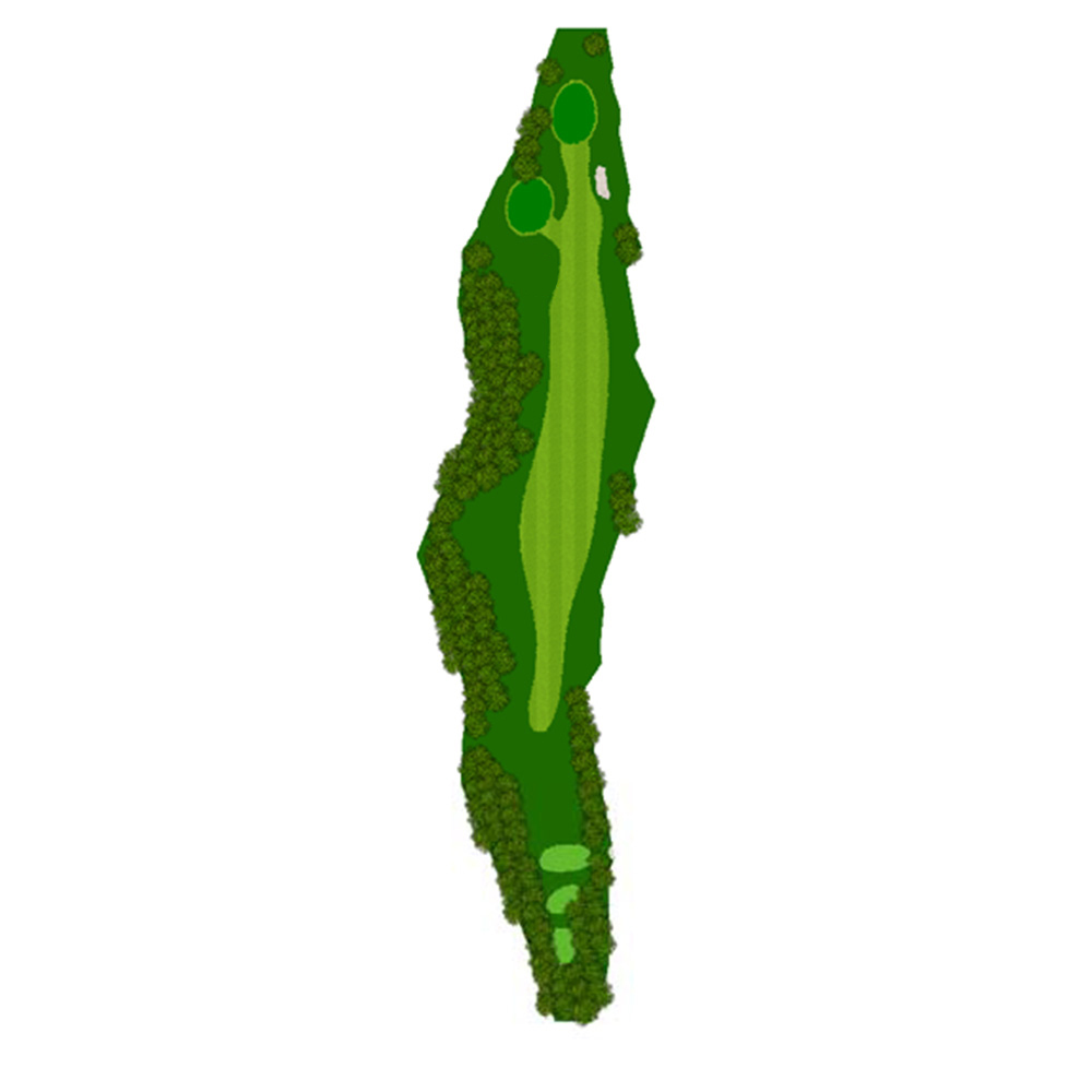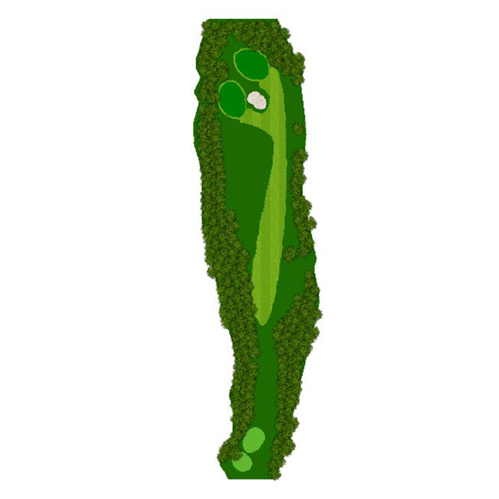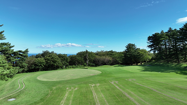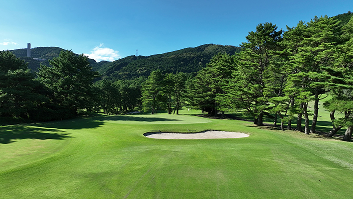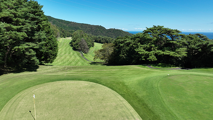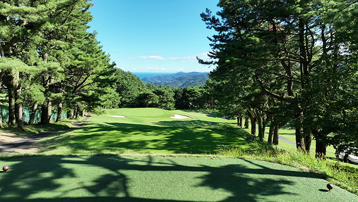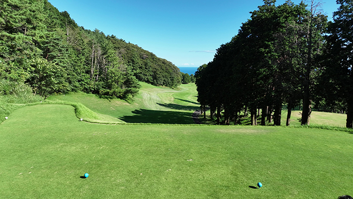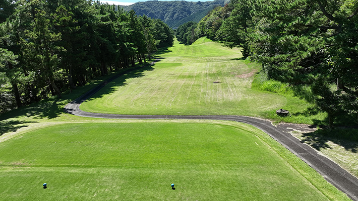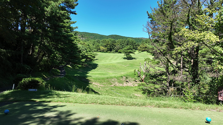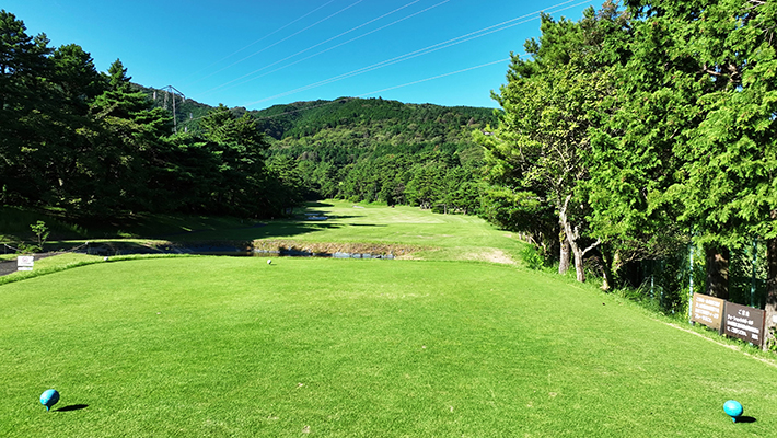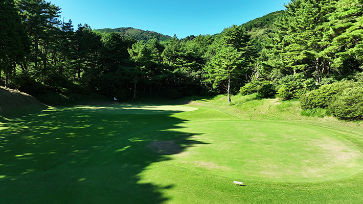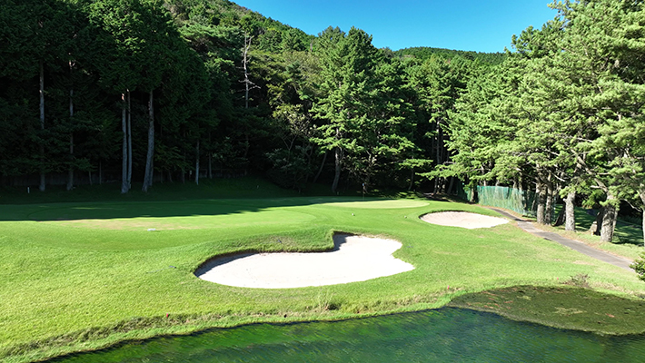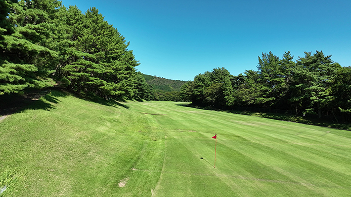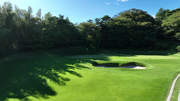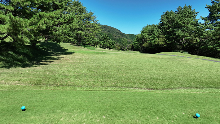 谷越えのショートホールでコース全体が右から左へ傾斜しているため正確なティーショットが要求される。