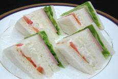 ミックスサンドウイッチ・生ハムのサラダ・五種盛り(串カツ・から揚げ・焼売・中華クラゲ・フライドポテト)・プチケーキ