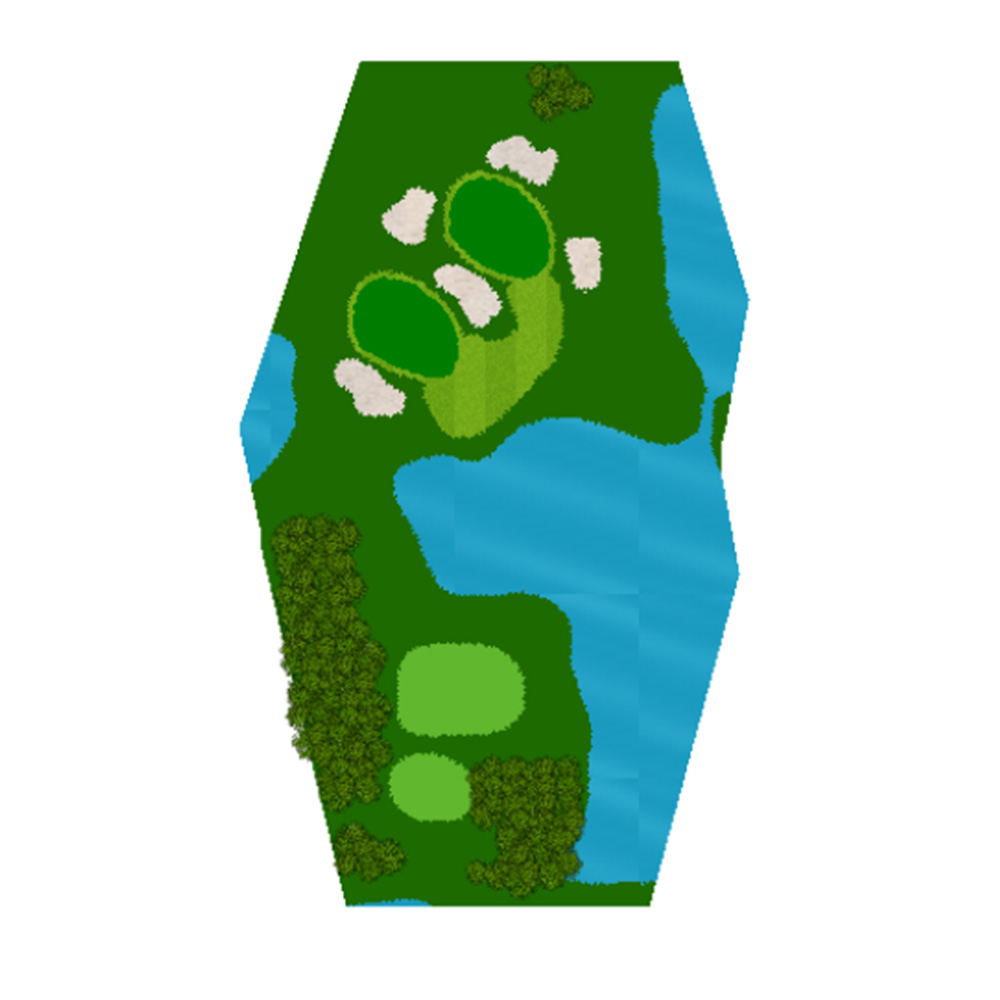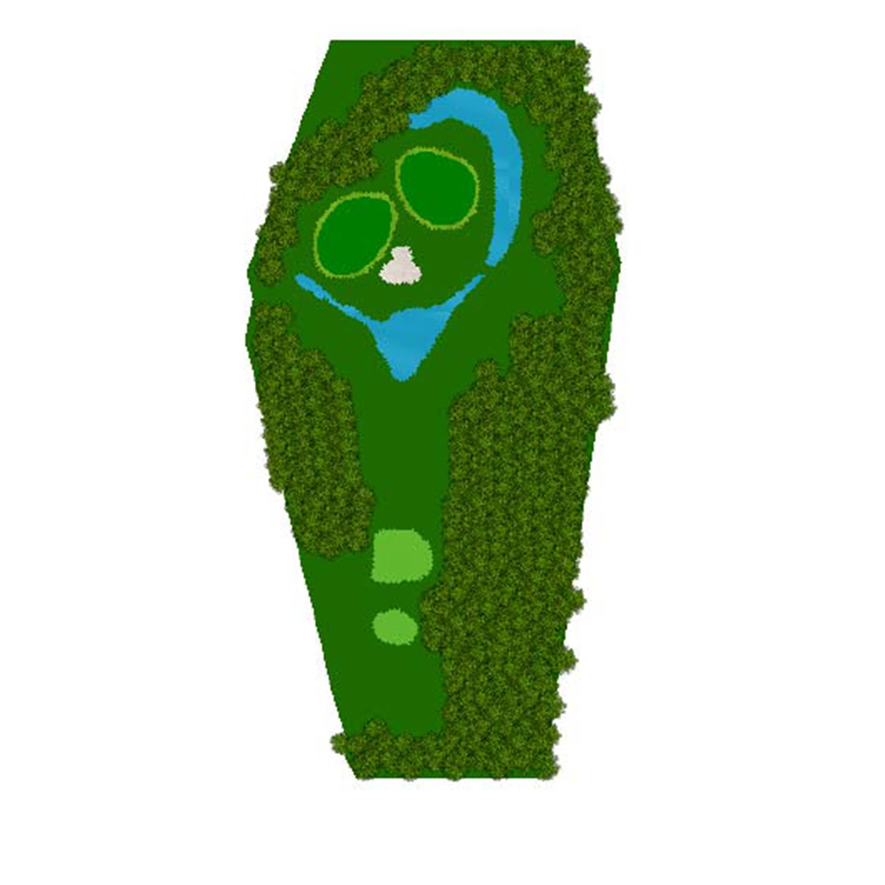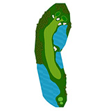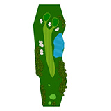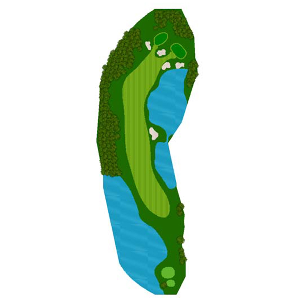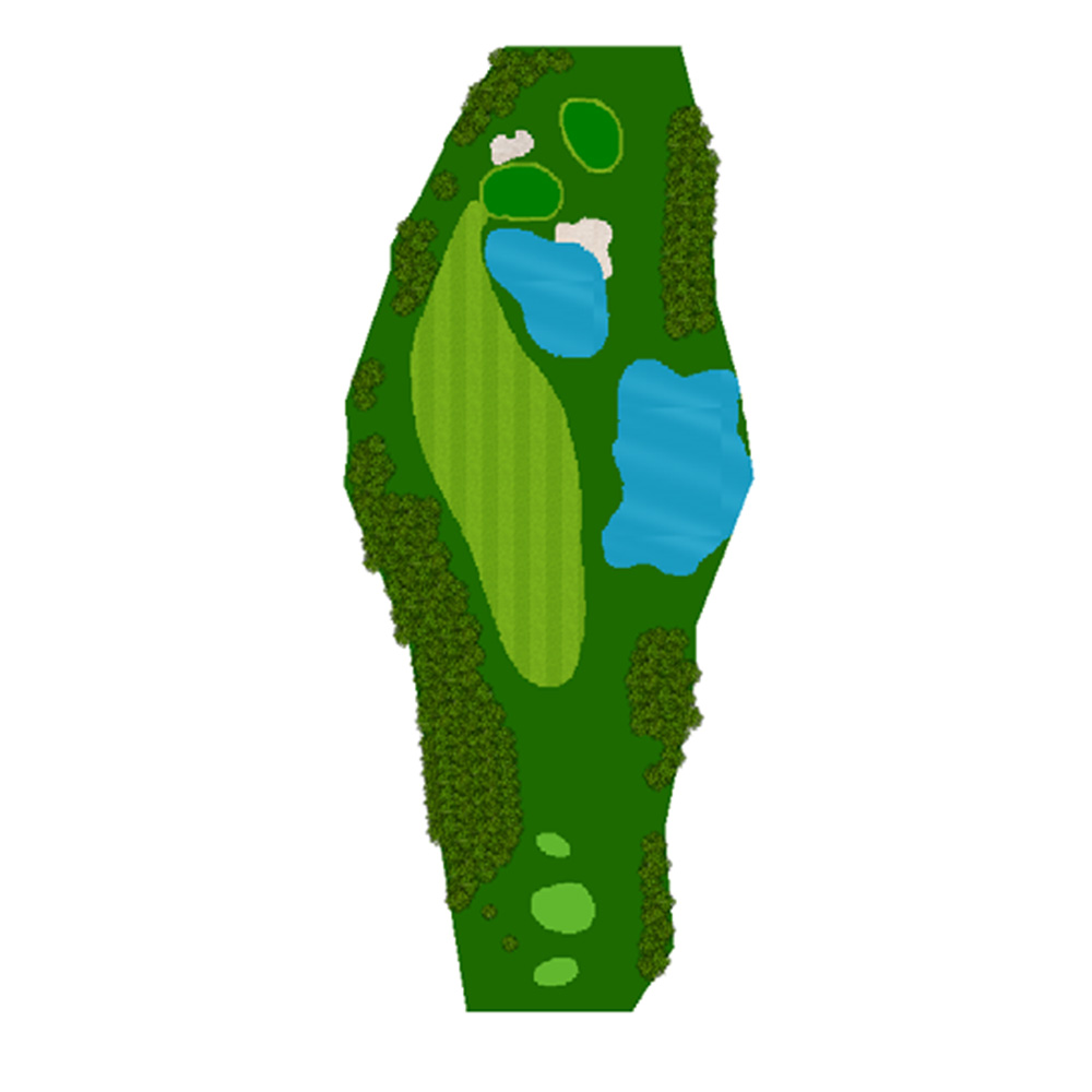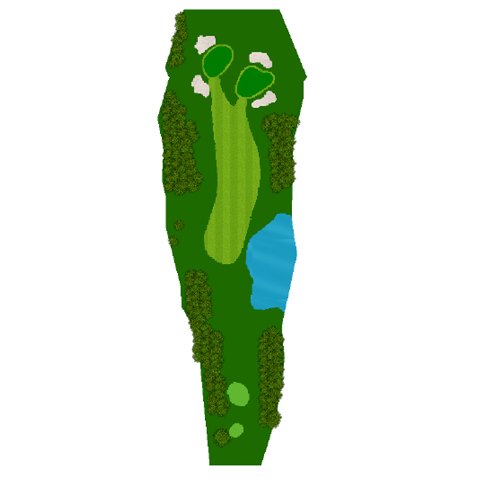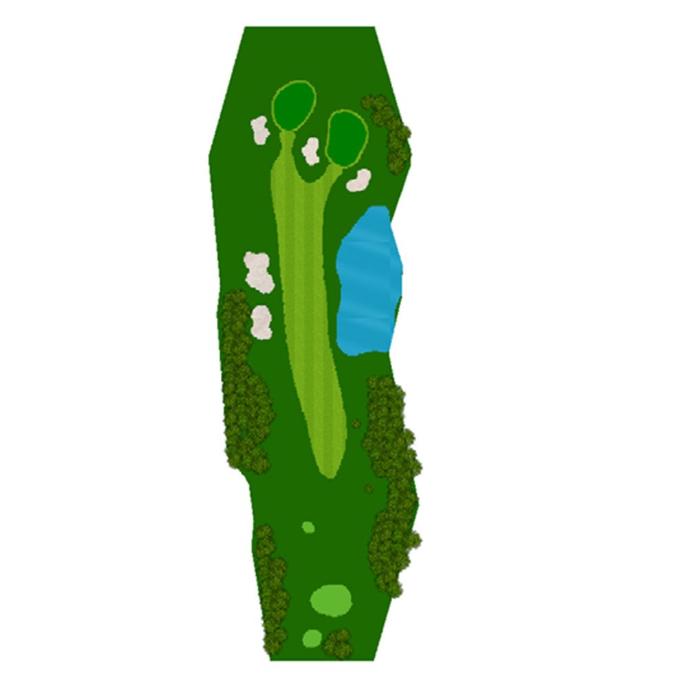池に囲まれたゆるやかな右ドッグレッグのホールです。