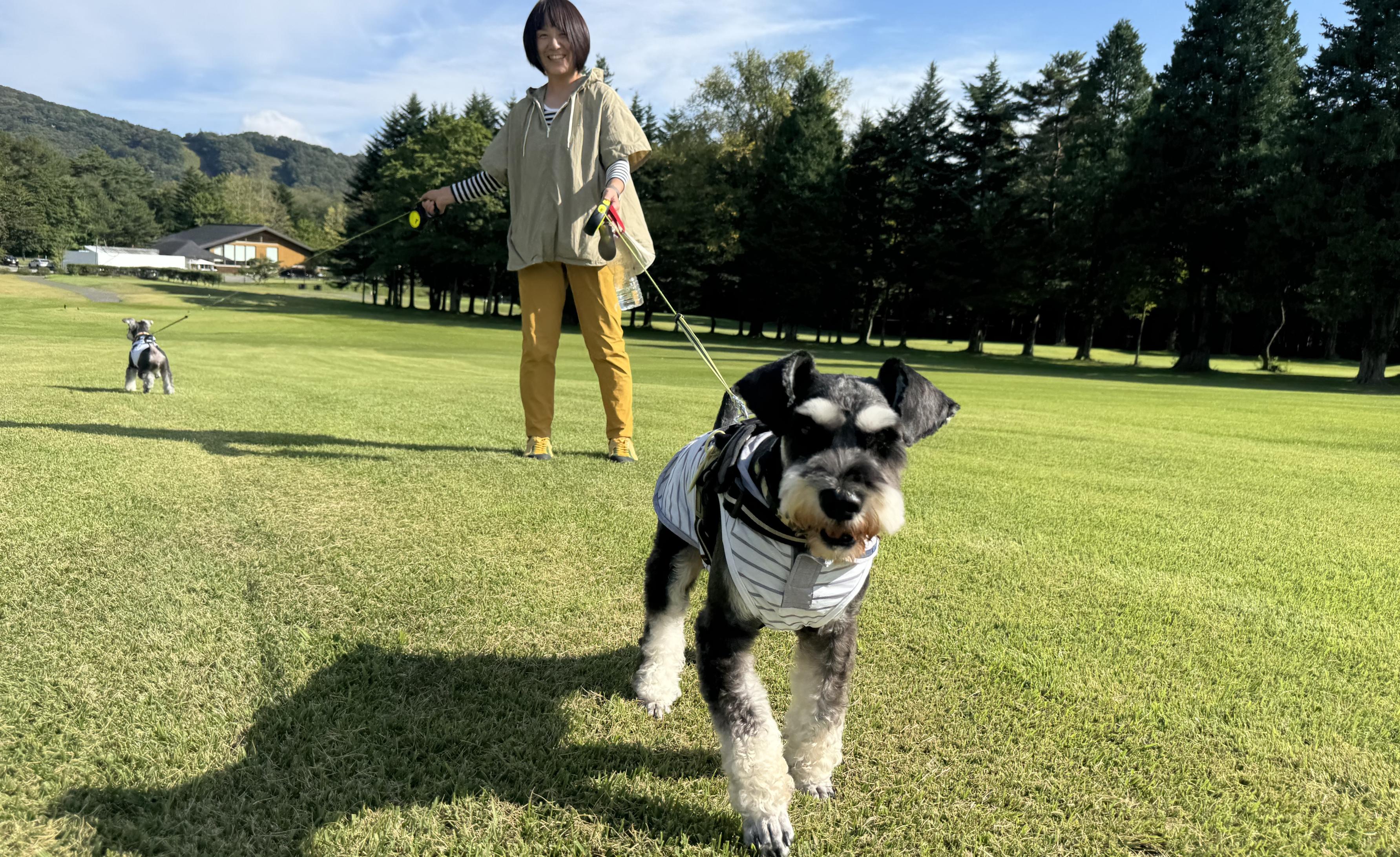 通常はコースにはご入場いただけないワンちゃんとご一緒に、ゴルフ場の芝生の上をお散歩いただけます。