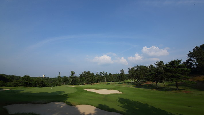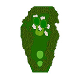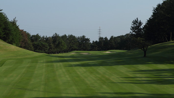 緩やかな打ち下ろしのミドルホール。左側にバンカーがあるのでティーショットの狙い目はやや右側。
