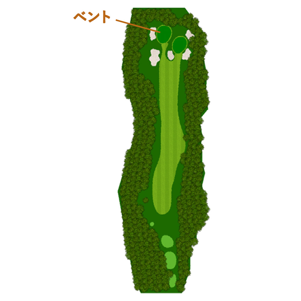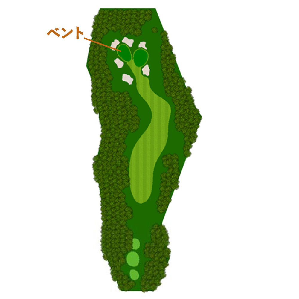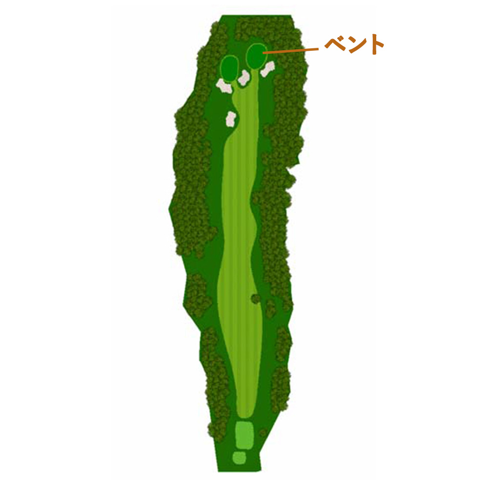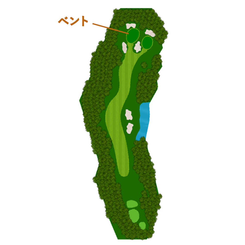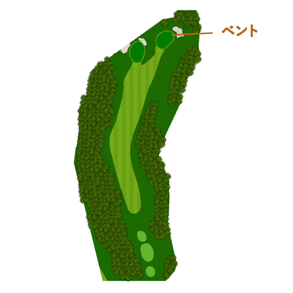 右にドッグレッグしておりフェアウェーも右から左に傾斜している。ティーショットは右山すそを狙う。