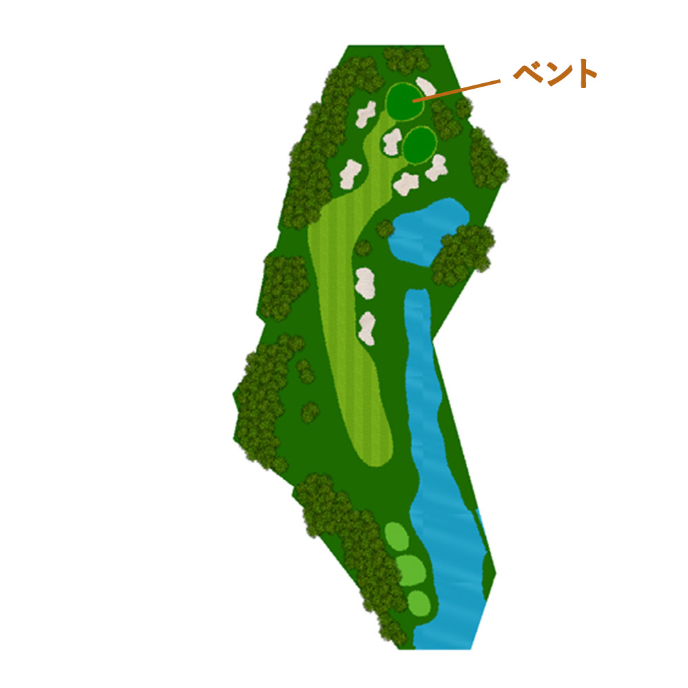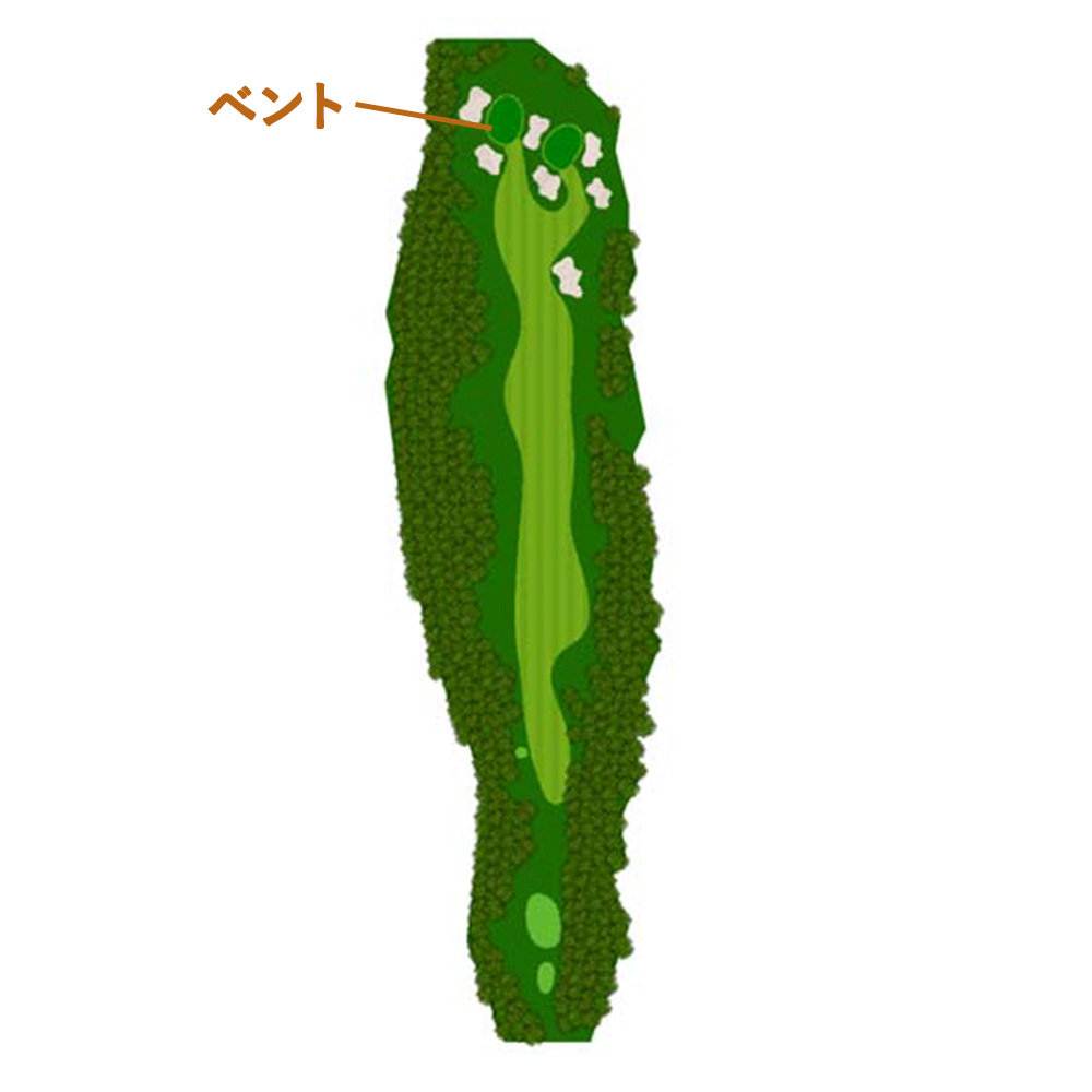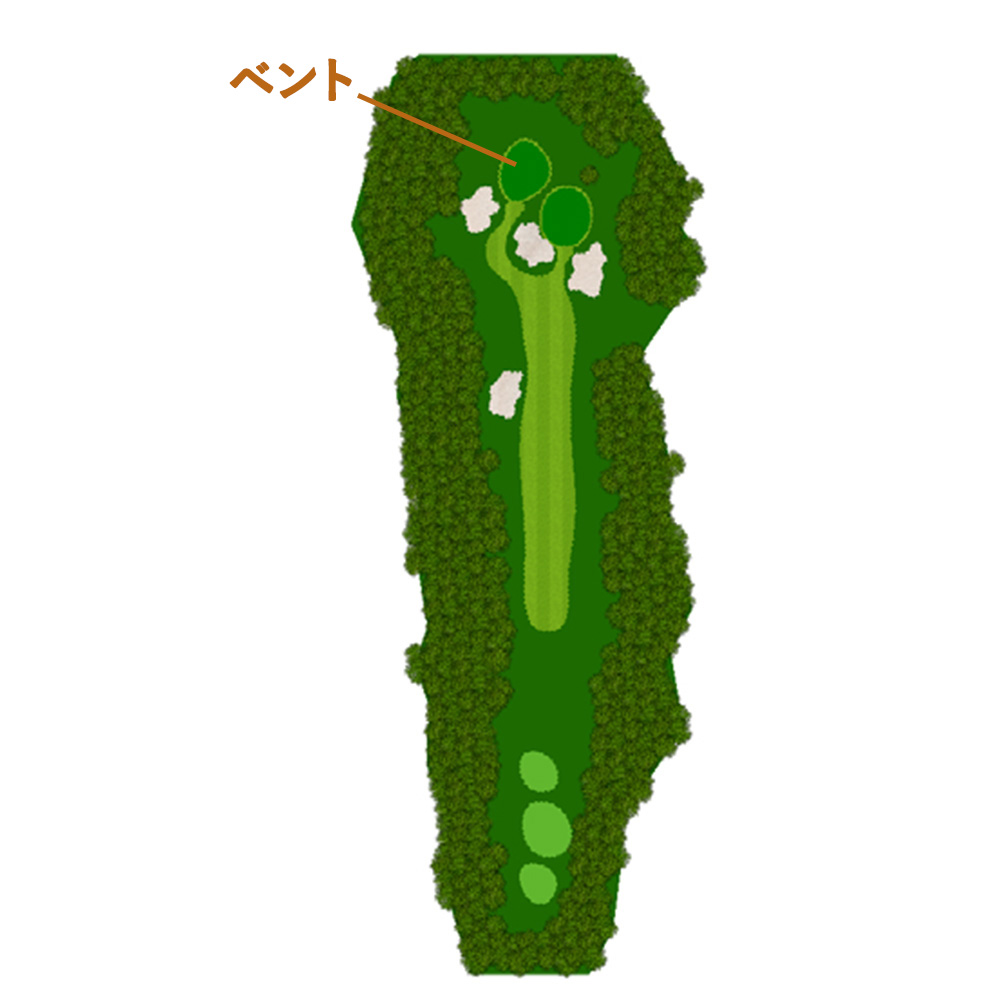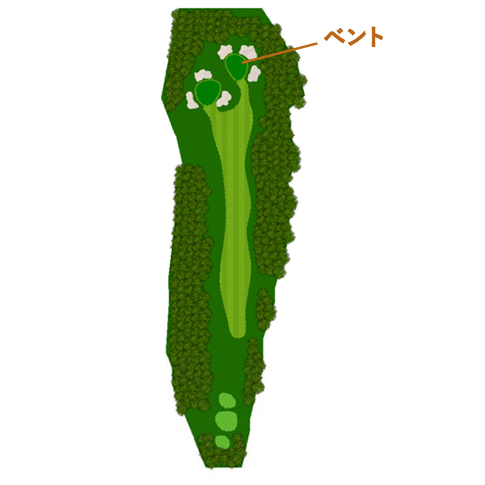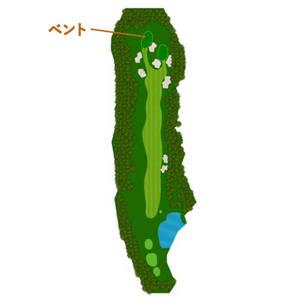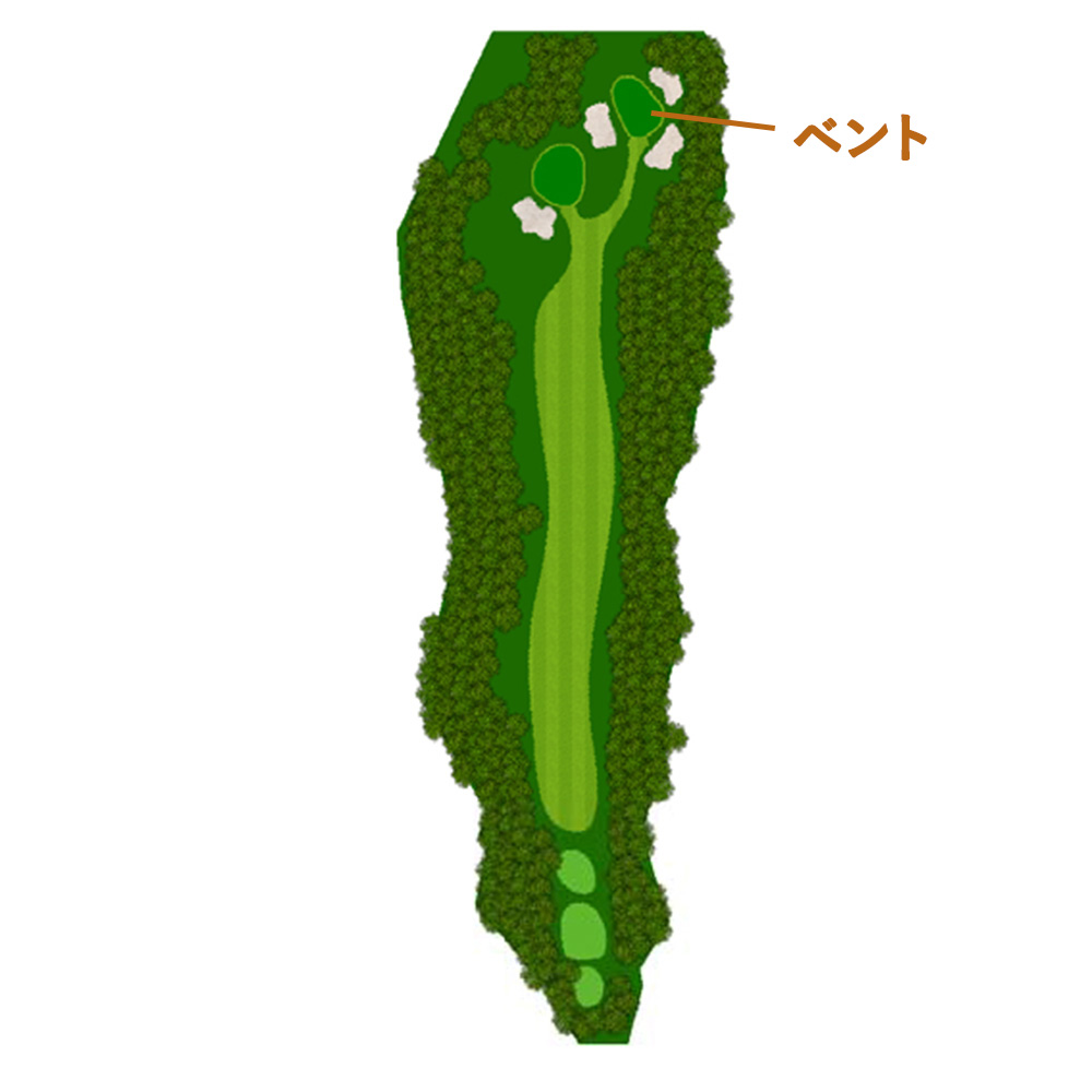 右にドッグレッグしておりフェアウェーも右から左に傾斜している。ティーショットは右山すそを狙う。