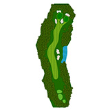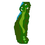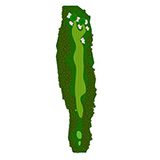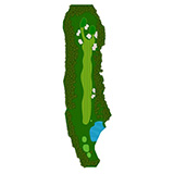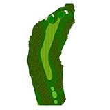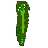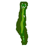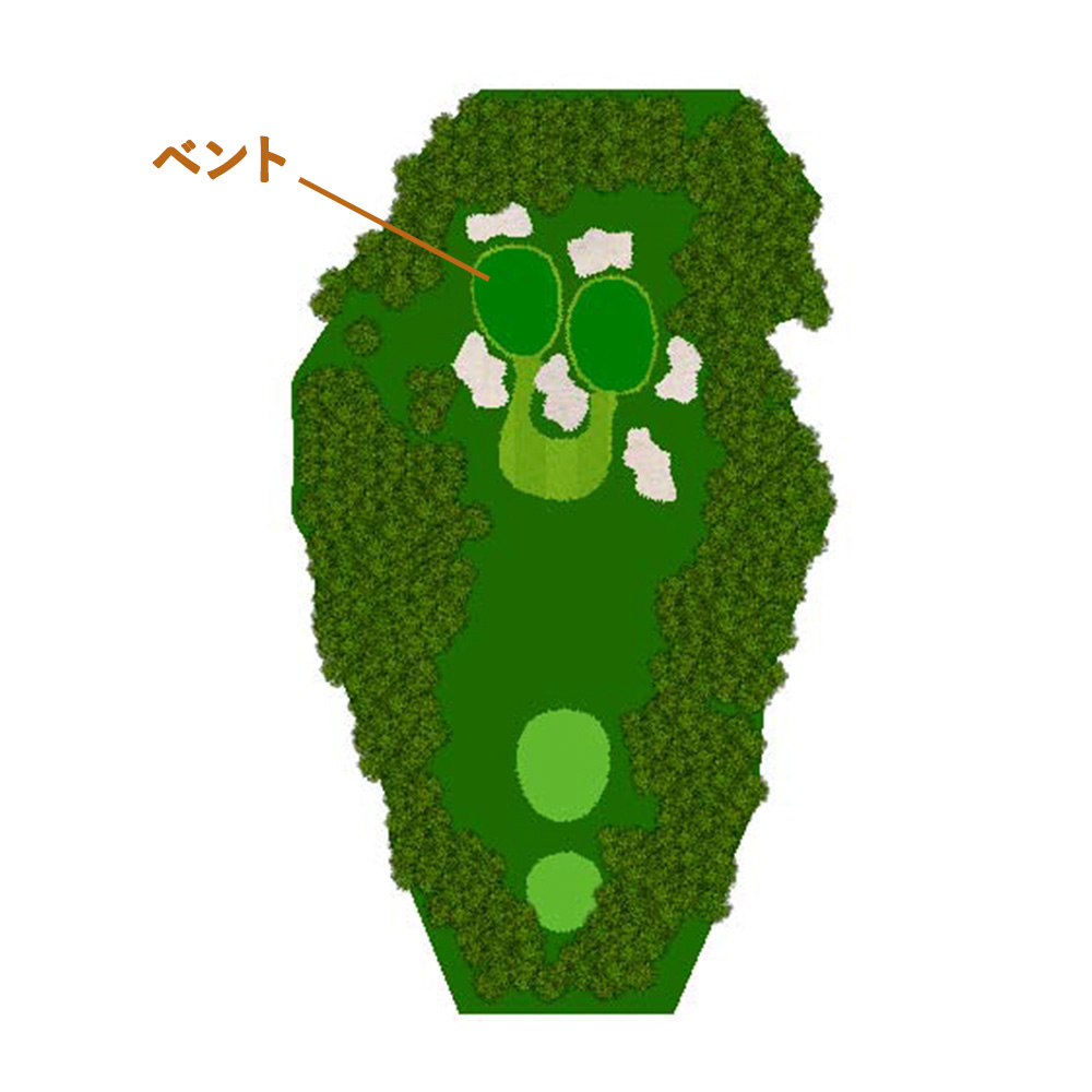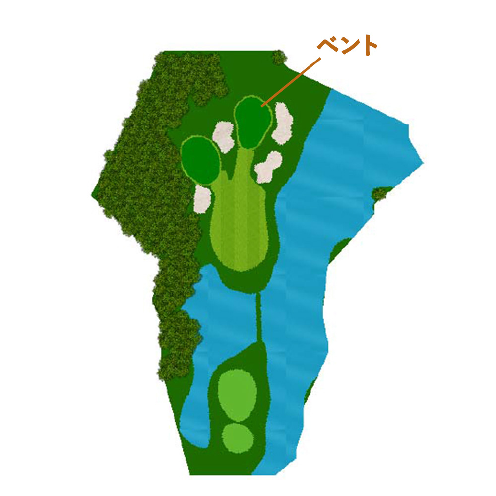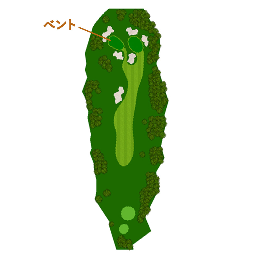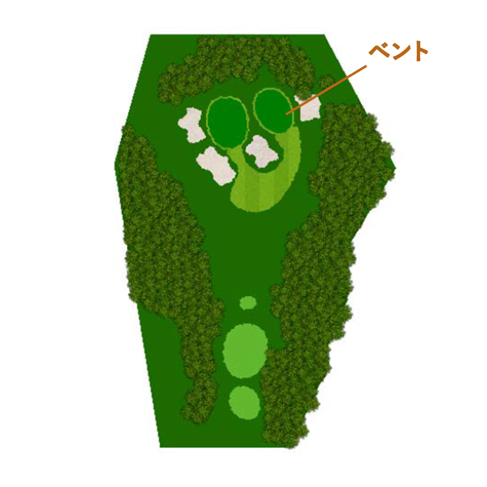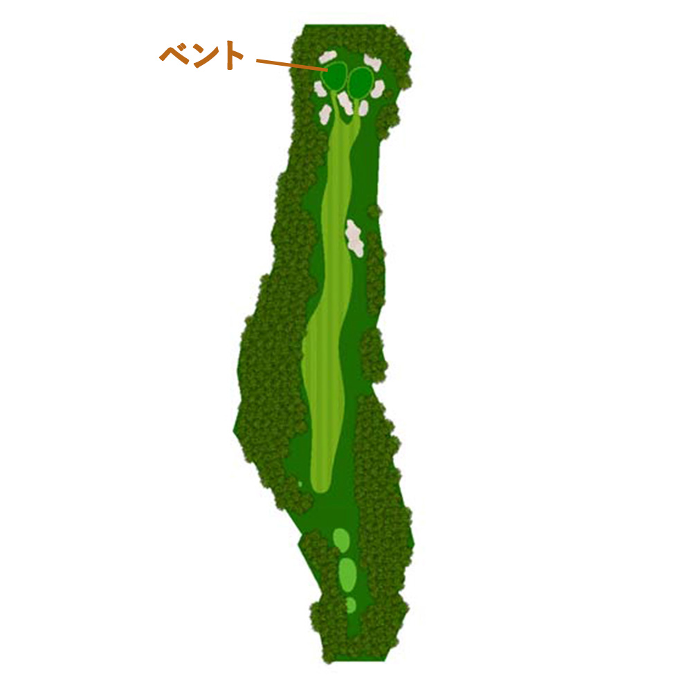 右にドッグレッグしておりフェアウェーも右から左に傾斜している。ティーショットは右山すそを狙う。