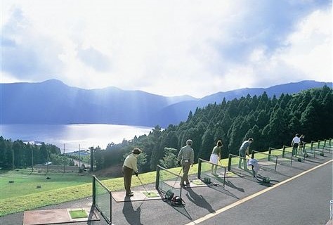 芦ノ湖にむかって打つ景色抜群の練習場。ラウンド前後の調整にどうぞ。
