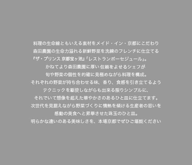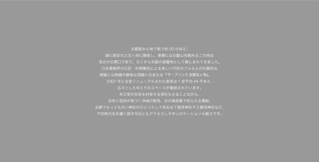 TEL:075-712-1111〒606-8505 京都府京都市左京区宝ヶ池ザ・プリンス 京都宝ヶ池内1F営業時間 12:00P.M.~3:00P.M. L.O.2:30P.M.(土・休日11:30A.M.~)/5:30P.M.~9:00P.M. L.O.8:30P.M.(鉄板焼き~L.O.8:00P.M.)