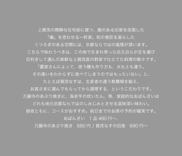 TEL:075-723-5217〒603-8044 京都府京都市北区上賀茂畔勝町25-2営業時間 11:30A.M.~3:30P.M.(L.O.2:30P.M.) / 5:30P.M.~10:30P.M.(L.O.9:30P.M.)(土曜・日曜・祝日5:00P.M.~22:00P.M. L.O.9:00P.M.)定休日 無休 (※貸切の場合もあり要確認)