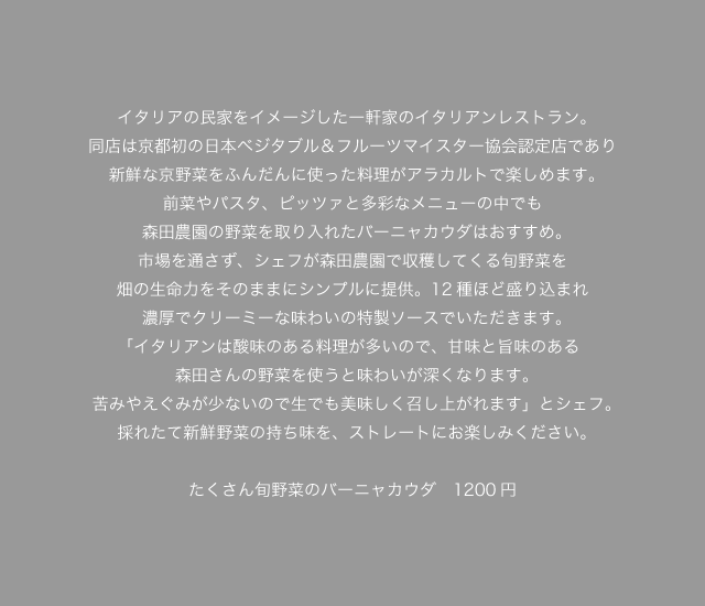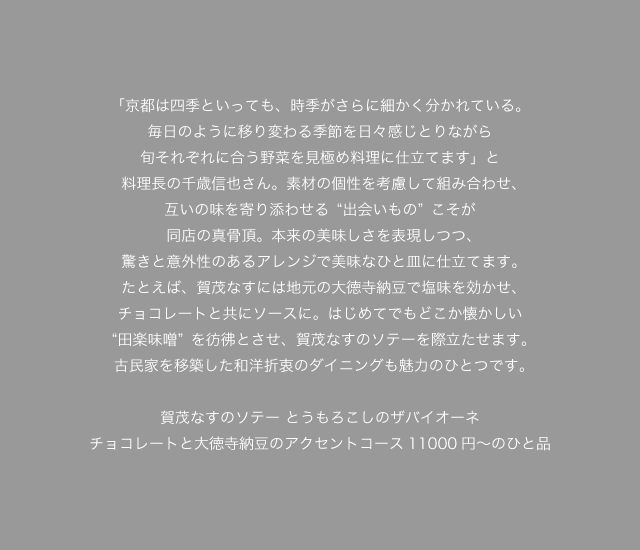 TEL:075-701-0162〒603-8081 京都府京都市北区上賀茂岡本町30営業時間 11:00A.M.~3:00P.M.(L.O.2:00P.M.) / 5:30P.M.~10:00P.M.(L.O.8:00P.M.)定休日 月曜 / 火曜臨時休業あり