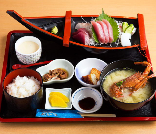 地物の刺身、小鉢がついた「伊勢海老味噌汁定食」。