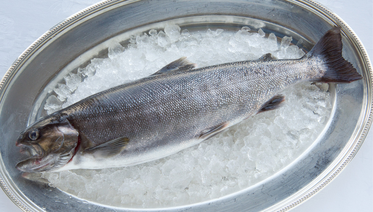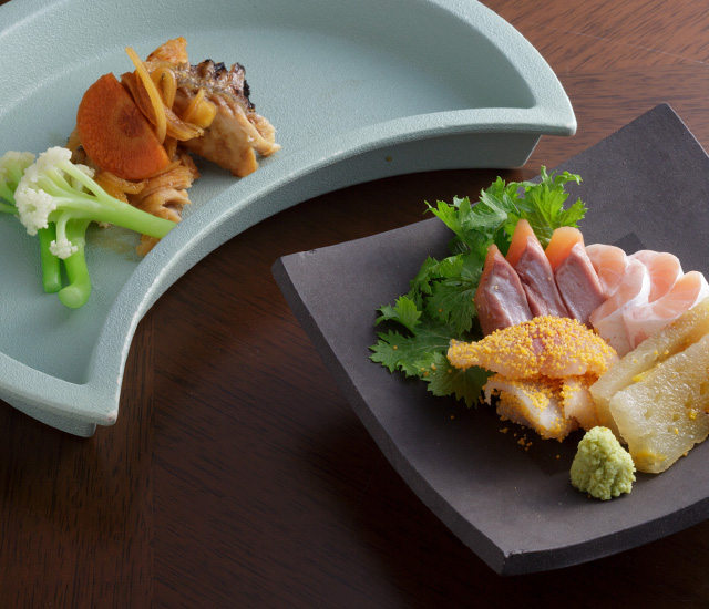 びわますの冷製、びわますの刺身 ともにコース7,500円~の一例