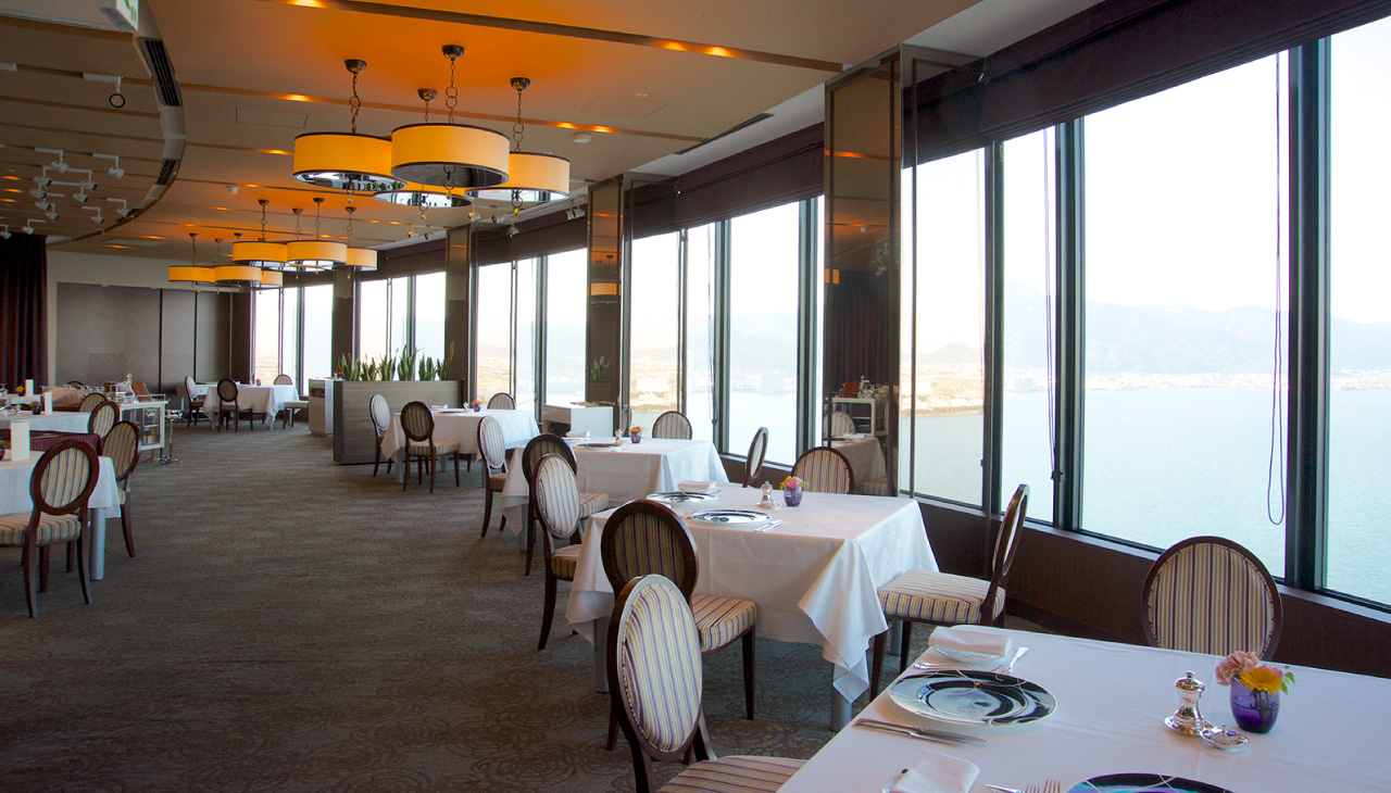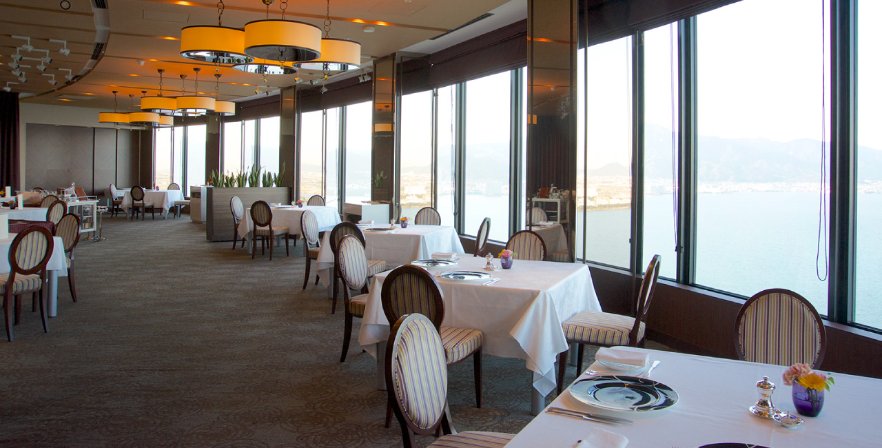 眼下に広々とした琵琶湖を見下ろす洗練のダイニング。