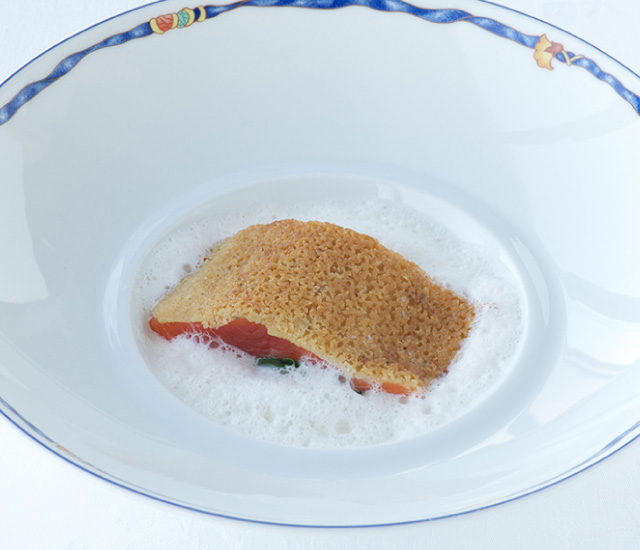 びわますのミ・キュイふな寿司のカプチーノ仕立て 13,200円のコースより