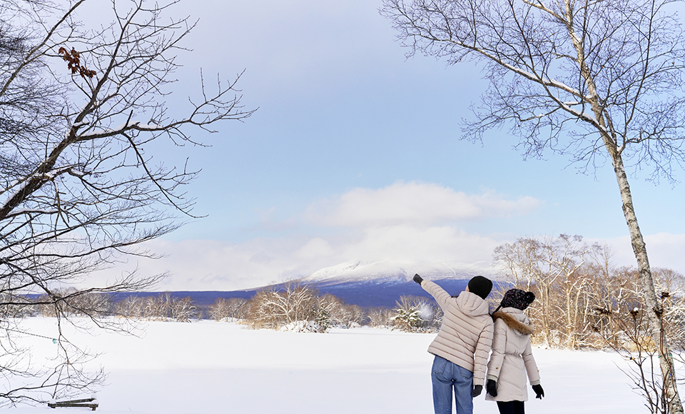 駒ヶ岳(1,133m)の噴火によってできた大沼・小沼・蓴菜沼(じゅんさいぬま)が広がる国定公園。春は水芭蕉、夏にはスイレンが開花、秋は紅葉、冬は雪景色と散策が楽しめます。
