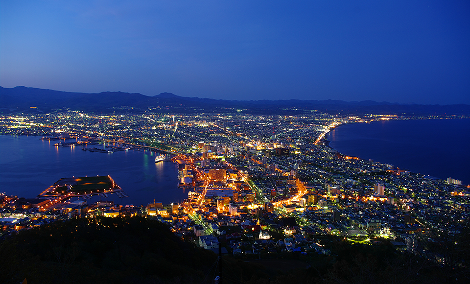 美しい函館の夜景を一望できる函館山。125人乗りの大きなロープウェーは、山頂までの3分間の空中散歩が楽しめます。夏から秋にかけて、イカ釣り船の漁火は函館の風物詩となっています。