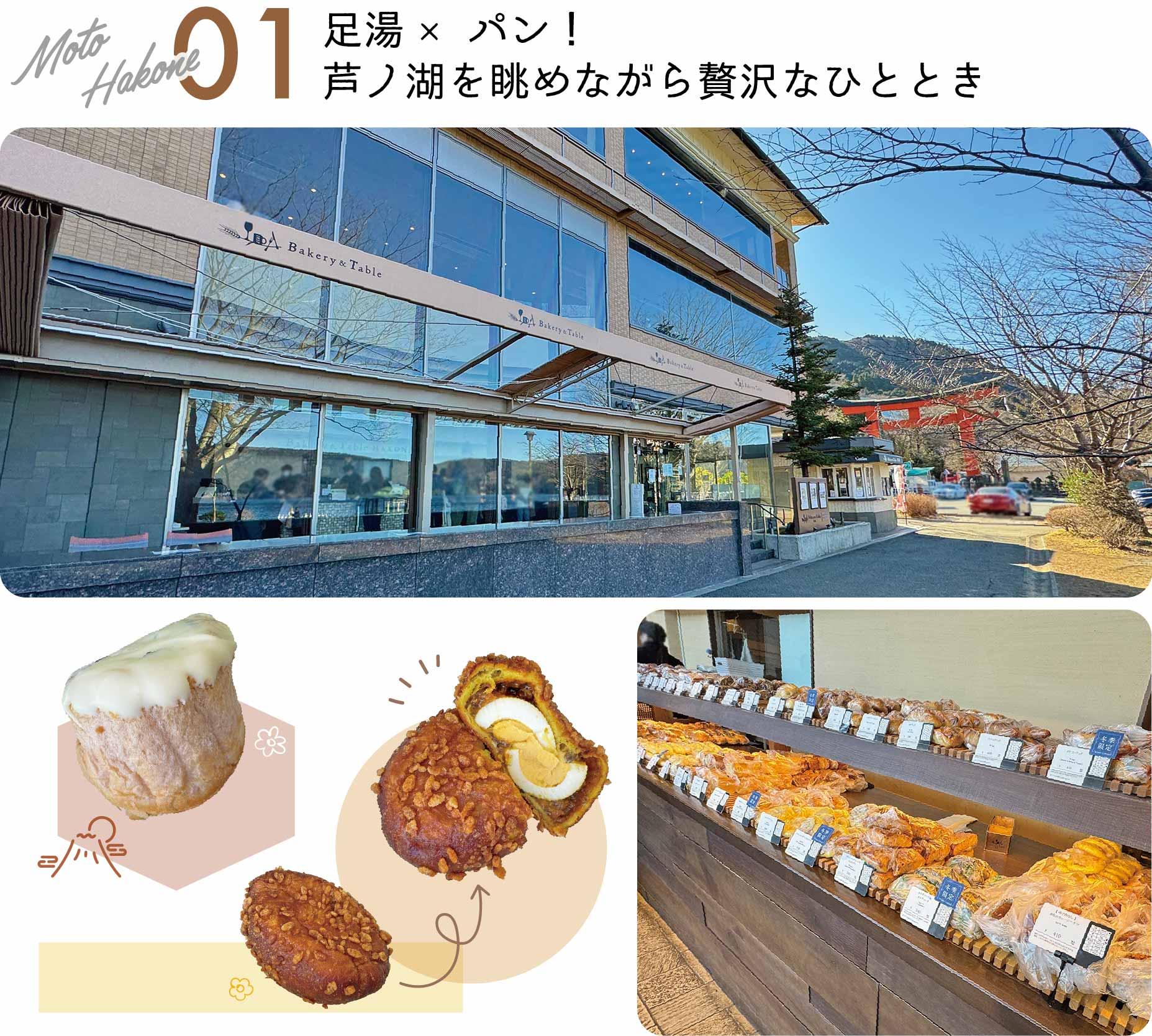 元箱根港から徒歩5分、芦ノ湖を望む絶好のロケーション。1階には足湯があり、焼きたてのパンとともにリラックスできるのが魅力です。湖を眺めながら、のんびりパンを味わう贅沢な時間が過ごせます。