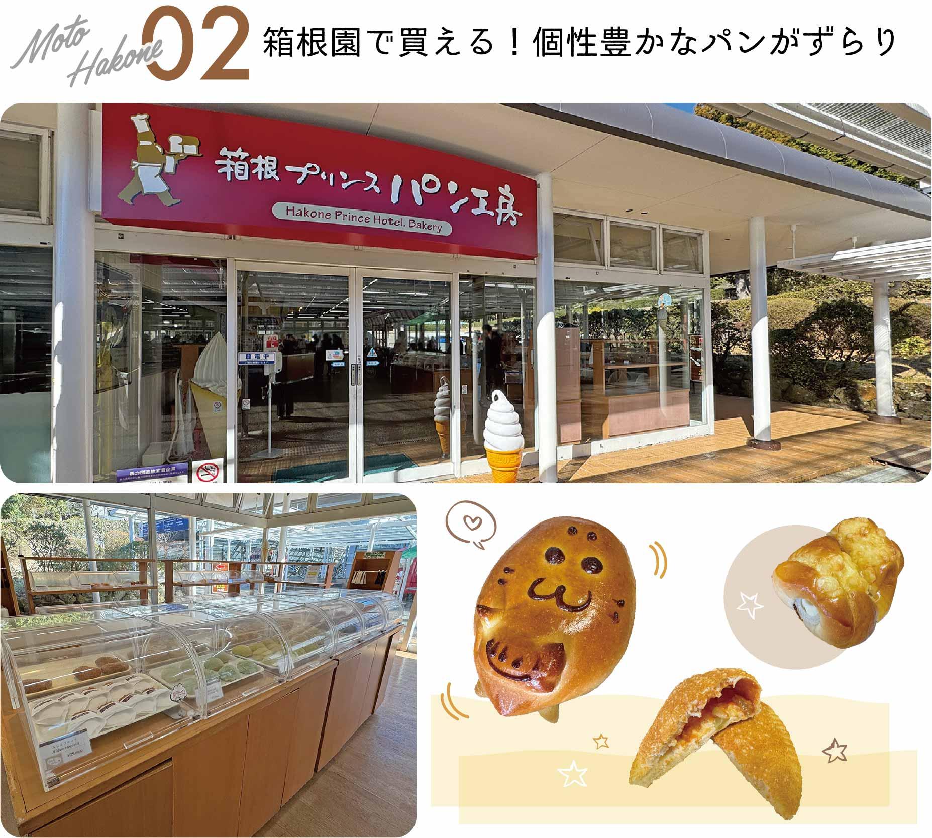 箱根園にあるベーカリーで、種類豊富なパンが揃っています。店頭には定番のパンから、箱根ならではのユニークなパンまでずらり。観光途中に立ち寄りやすく、軽食やおやつにぴったりのお店です。