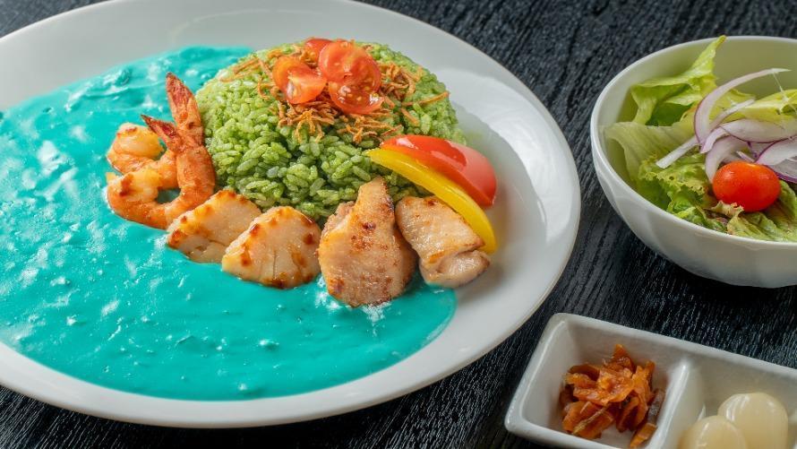緑のライスと青いカレーで見た目のインパクト、SNS映え抜群な箱根園の新たな名物へ。