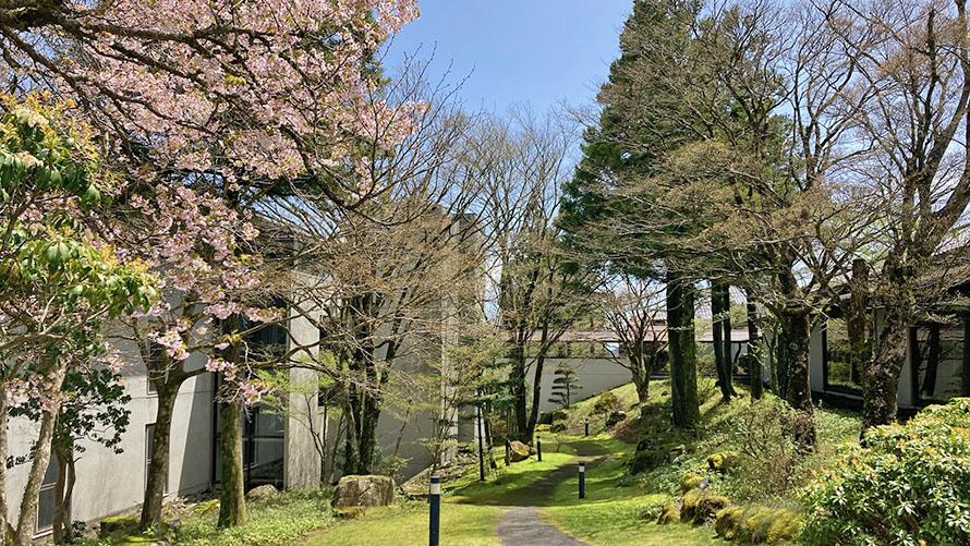 標高935mと、箱根で一番標高が高い宿の箱根湯の花プリンスホテルでは、4月中旬になると、中庭に新芽が芽吹く木々と咲き乱れる桜に、つくしやツバキ、ヤマブキなど、春の強い生命力を感じることができます。