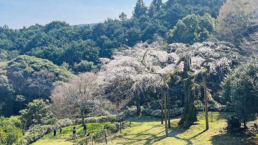 入生田にある長興山紹太寺の境内には、高さ13m、枝張り13m、幹回り4.7m、推定樹齢350年以上のシダレザクラがあります。江戸時代の小田原藩主 稲葉正則が両親と祖母の霊を弔うために植えたと伝えられている大木は、「かながわの名木100選」に選ばれ、花が滝のように垂れ下がる満開の姿は、見事のひと言に尽きます。