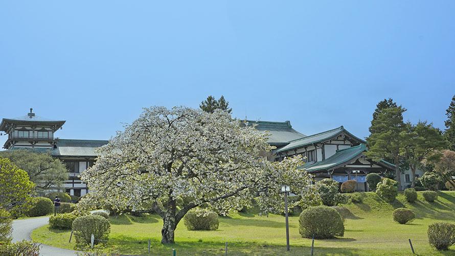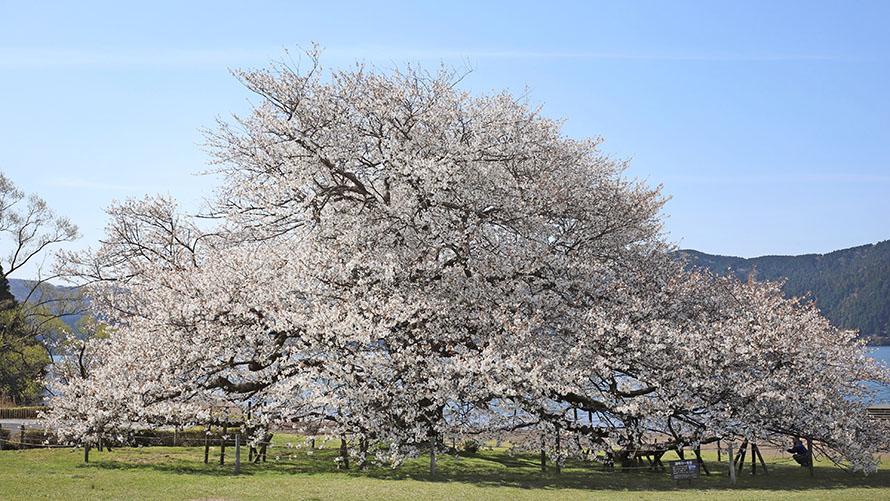 樹齢約100年、5本のオオシマザクラを植え寄せた一本桜は、高さ約12m、枝張り22m、幹回り5m、周囲約70m。満開を迎えると富士山のような形になり、淡いピンクを帯びた白い花を咲かせます。