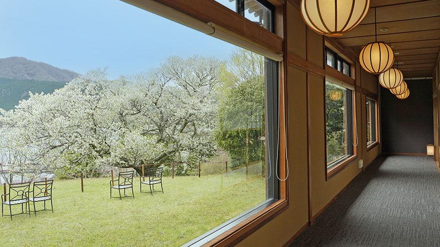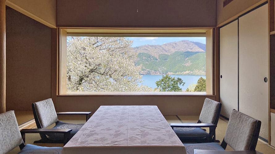 角部屋の目の前に植えられたオオシマザクラは、1990年に龍宮殿別館がオープンする際に移植されてきたもので、樹齢は約50年です。窓際に座り、お茶を飲みながら桜・芦ノ湖と富士山を眺める時間は、言葉にできないほどの思い出になります。