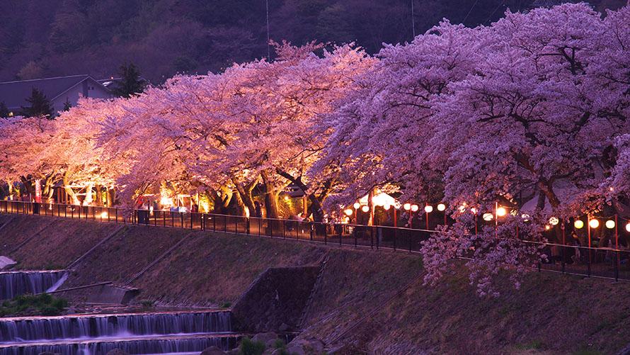 箱根屈指の桜名所「宮城野 早川堤」。早川沿いに続く約120本のソメイヨシノ、川のせせらぎをBGMにゆっくりと散策しながらお花見ができます。また、近くの国道138号線沿いには約100本のシダレザクラの並木があり、桜まつり期間中はライトアップも行われるので、昼夜で異なる桜の雰囲気が楽しめます。
