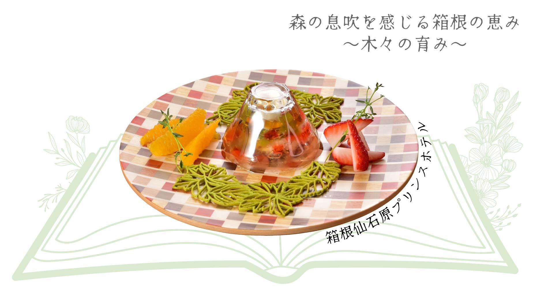 森の恵みをイメージした彩、香り、味、食感、動きを楽しみながら、地産食材を寄せ集めた寄木の寄せスイーツで森の息吹を感じる一皿。ゼリーと焼菓子の新しい食感のハーモニーとバランスもご堪能いただけます。