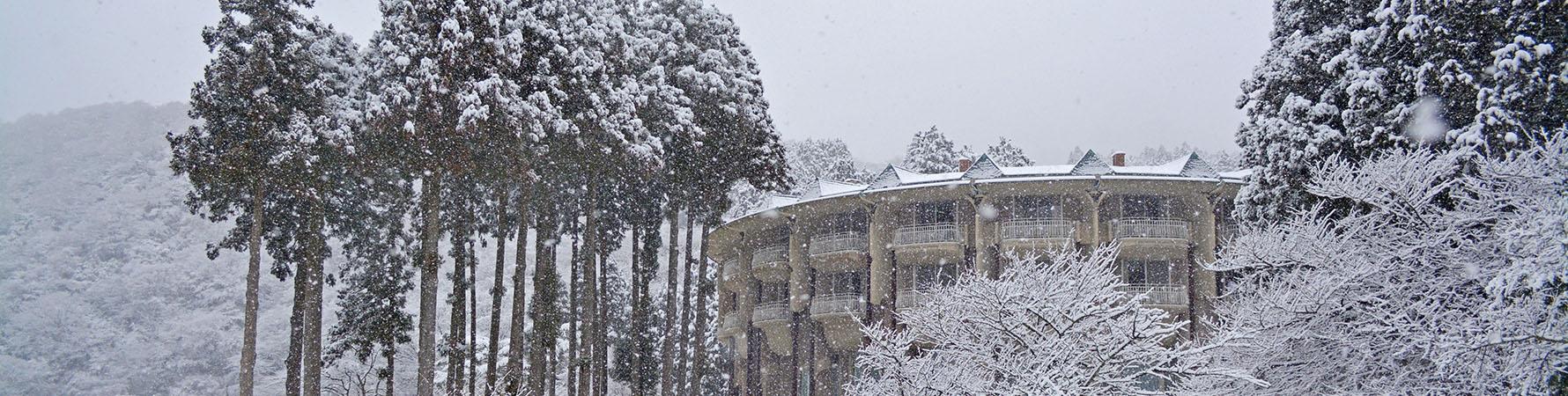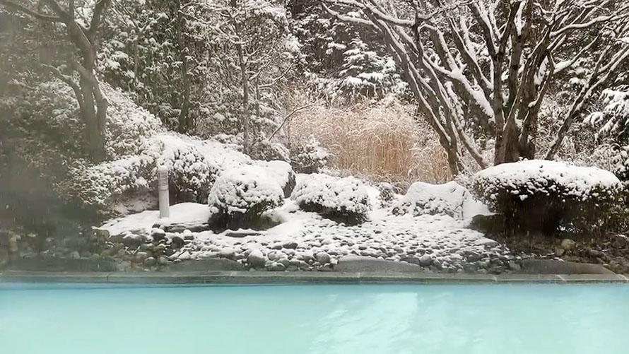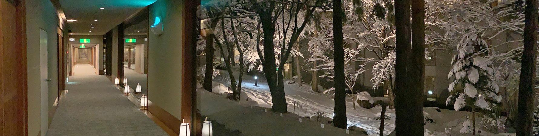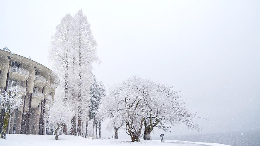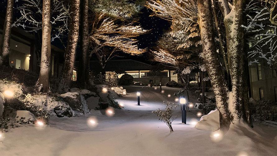ゆらゆらと舞い降りる雪花、辺り一面真っ白に染まるホテルの中庭。まるでここには自分しかいないような静謐さ、これは限られたときにしか見られない景色。