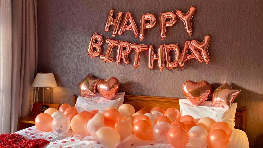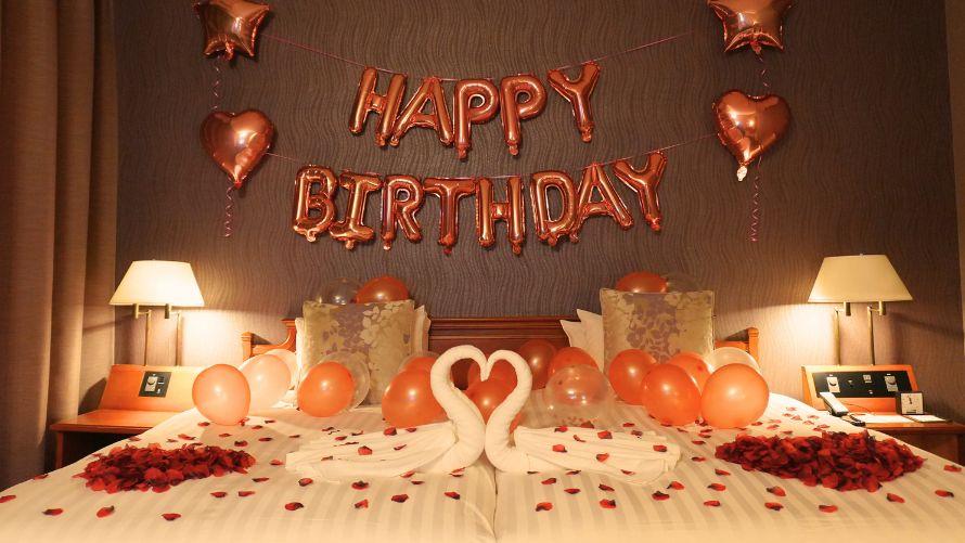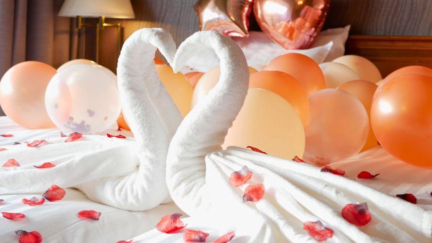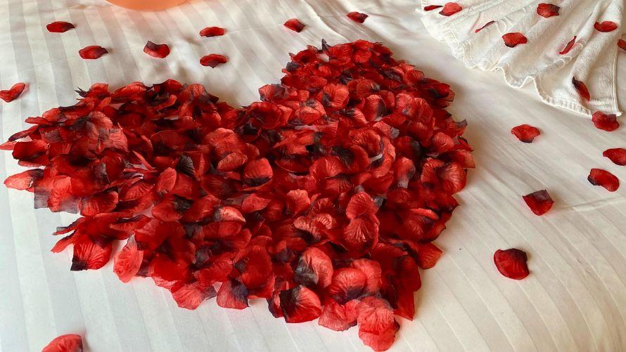 ・ベッドの上に赤い花びらでハートの形に飾り付けをします。