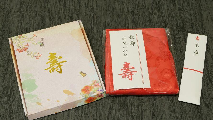・赤いちゃんちゃんこと扇子がセットになっています。