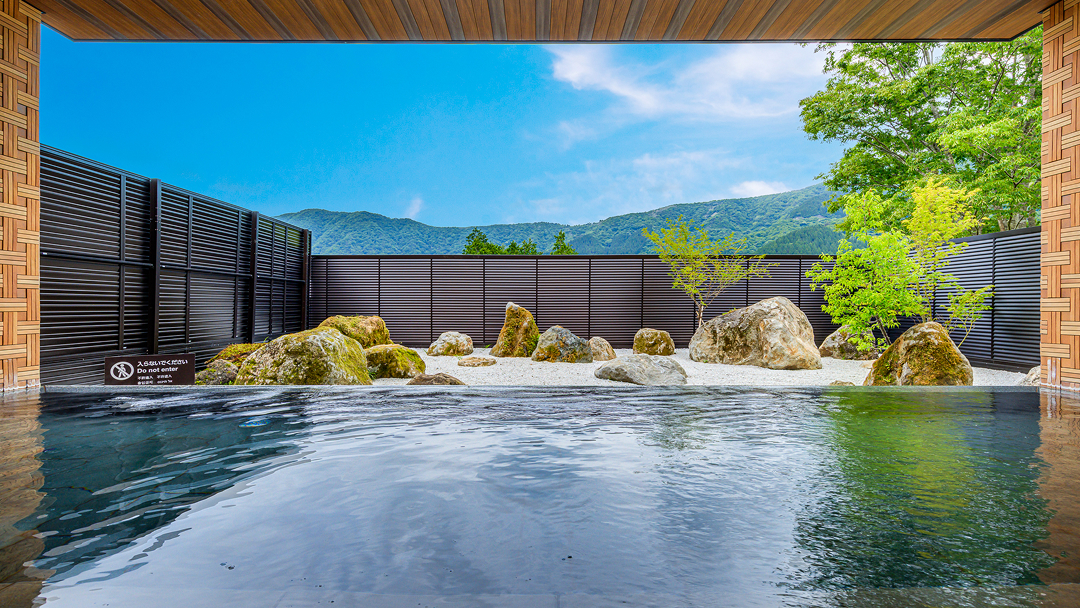 雄大な箱根外輪山を眺めながら、ゆったりと露天風呂はいかがでしょうか。箱根寄木細工をモチーフとした特徴的な壁面が目を楽しませ、非日常なひとときを味わえます。温泉は箱根十七湯のひとつ、「姥子温泉」を源泉としており、肌触りがやわらかく、日々の疲れを癒やしてくれる安らぎの時間を堪能してみては。
